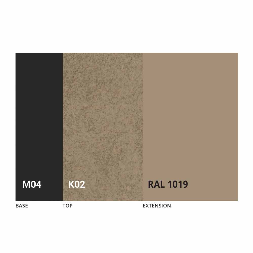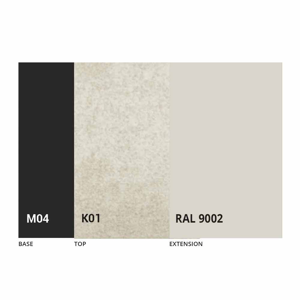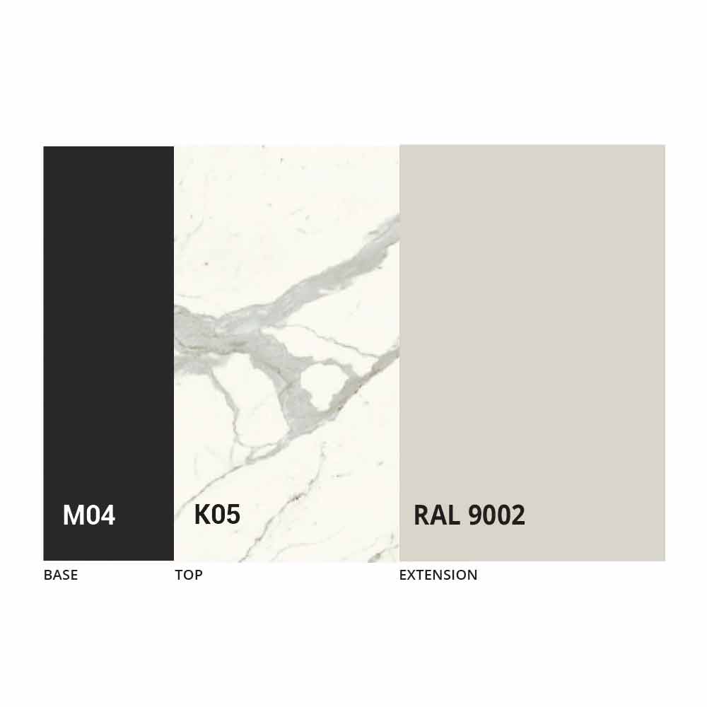 The top, the extension and the base of the table can be customized with different sample finishes. For information, contact us using the "