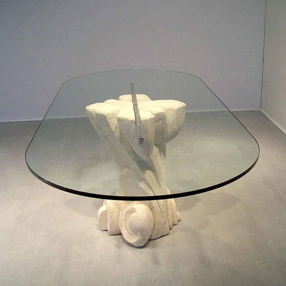 The dining table Afrodite is entirely made in Italy. Its base is made of Vicenza natural stone and it has been hand-carved from the original stone block. The table top is made of float crystal (15 mm thickness) which is supported by a painted brushed metal bar.