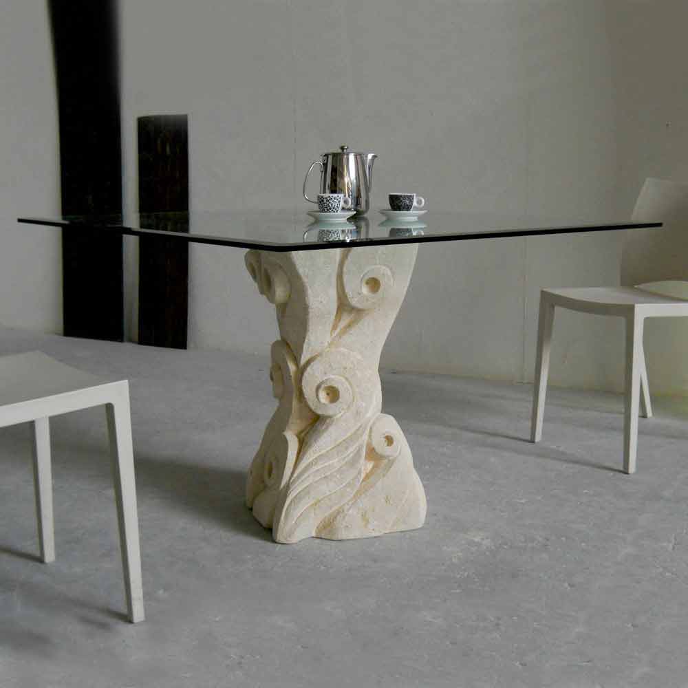 The dining table Giasone is entirely made in Italy. Its base is made of Vicenza natural stone and it has been hand-carved from the original stone block. The table top is made of float crystal (15 mm thickness) which has been secured to the base with an extractable steel flange.