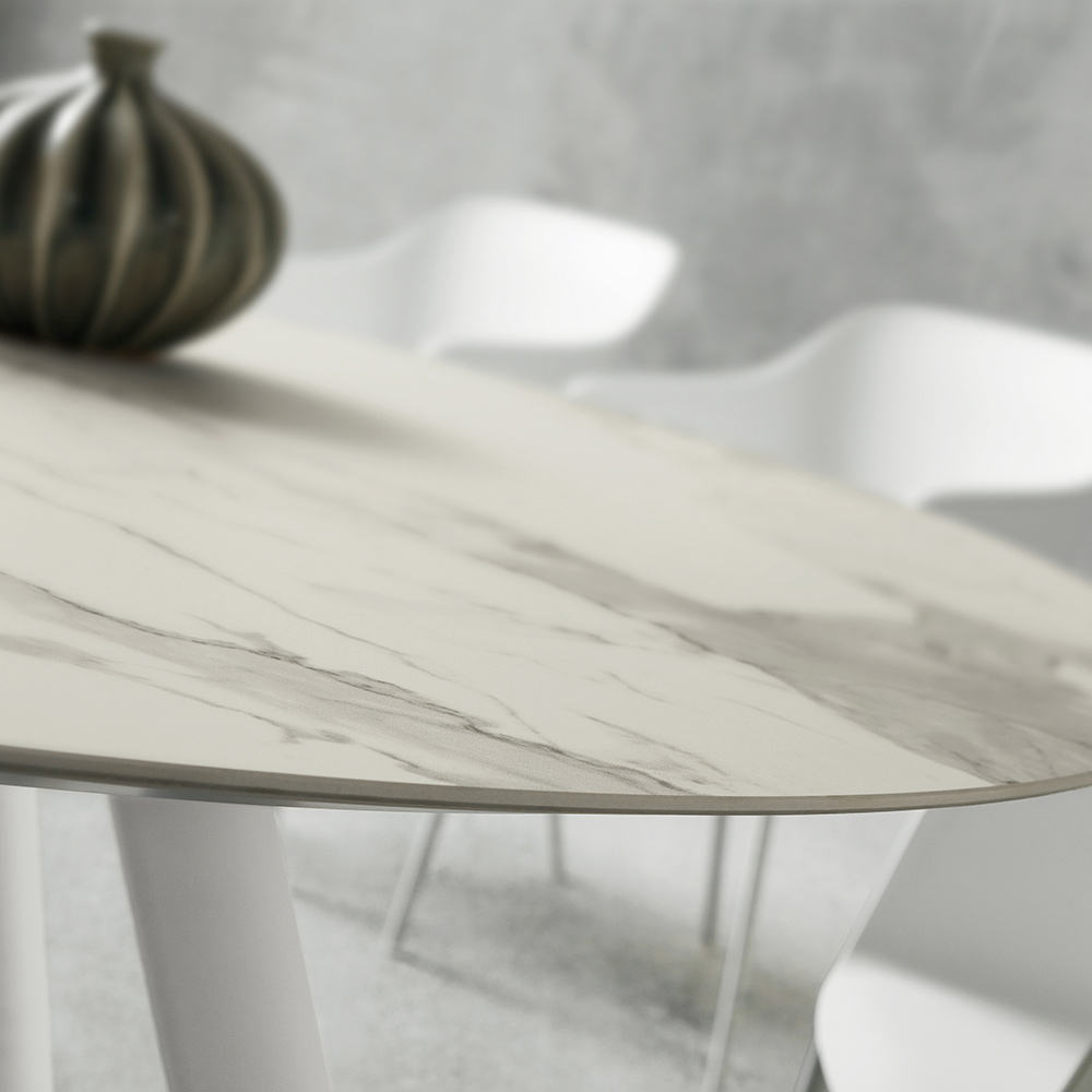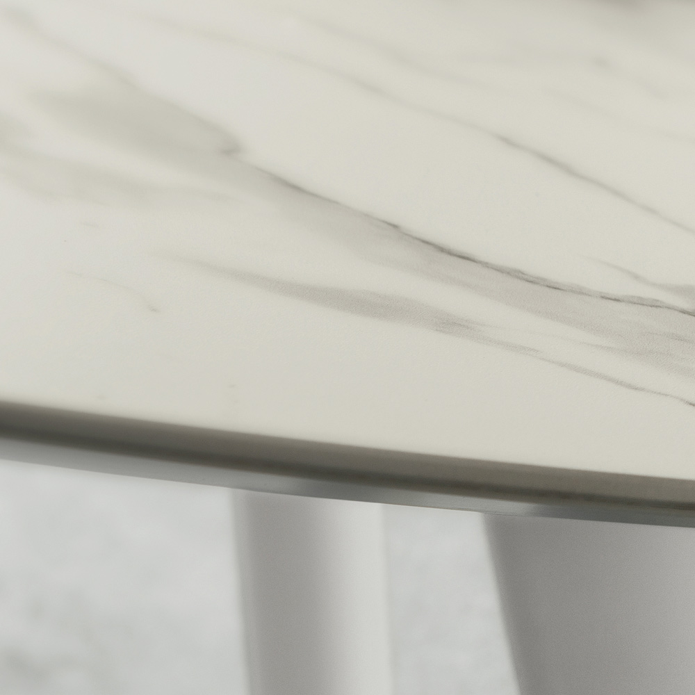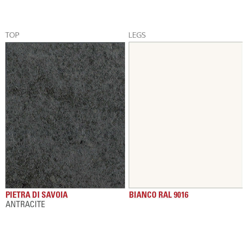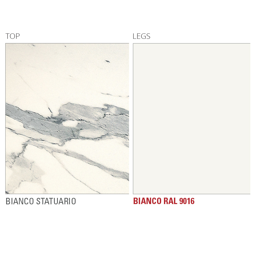 lacquered aluminum legs in white finish. From the encounter between the timeless elegance of the marble effect and the stone effect and the modern touch of aluminium, a piece of furniture with a