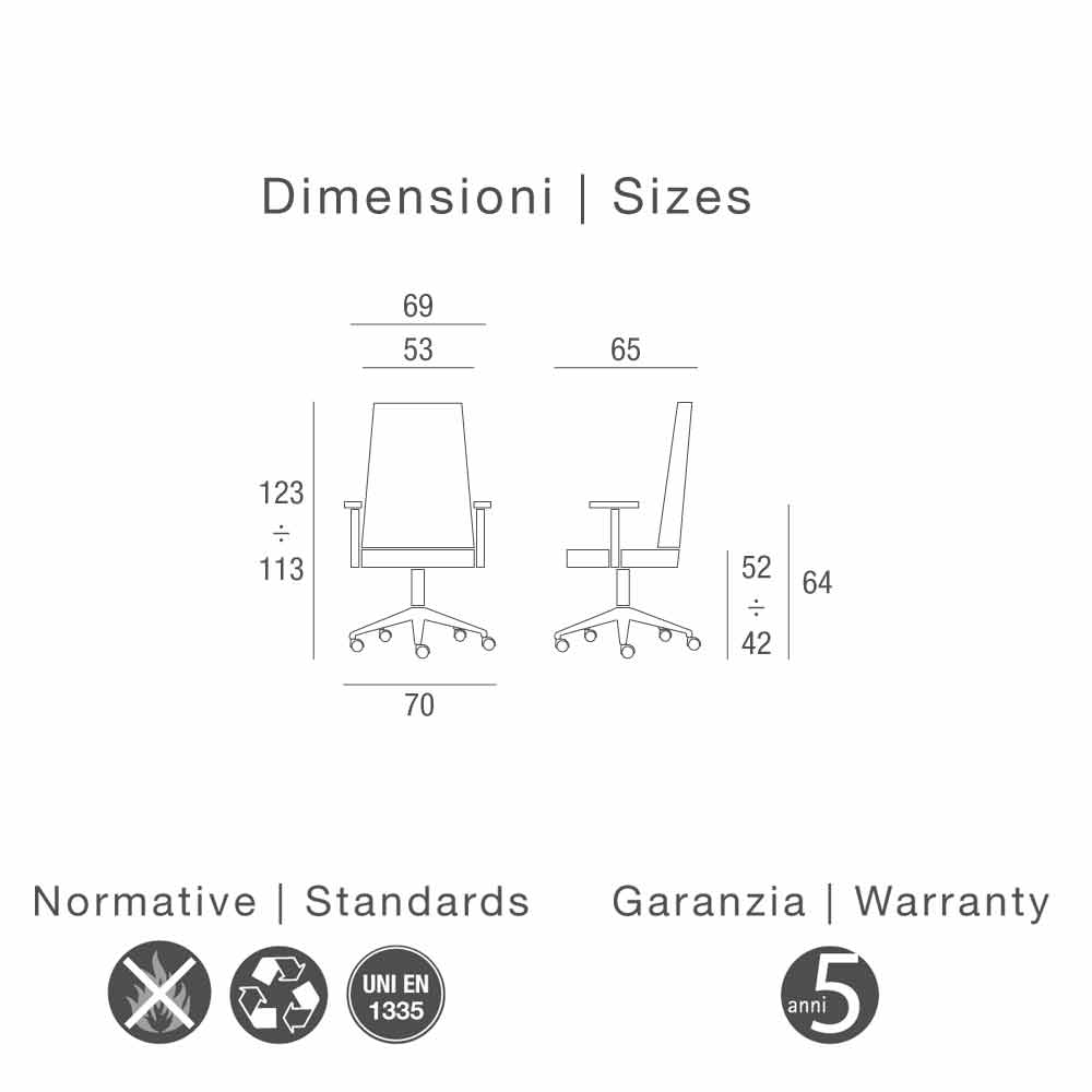 High-back executive chair with aluminium armrests. 5-star die-cast aluminium base with self-bracking castor wheels, Ø 50 mm.