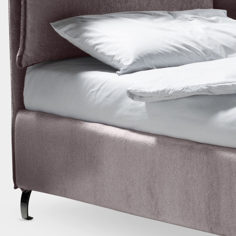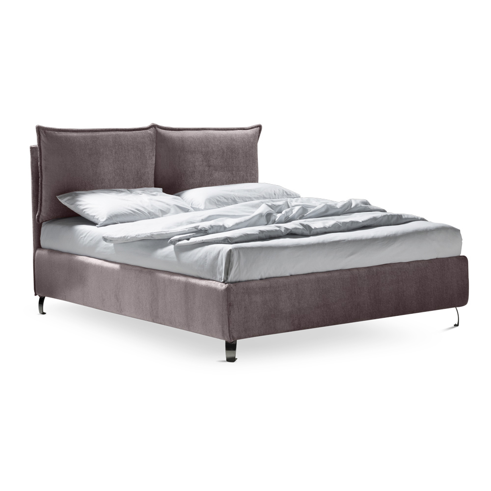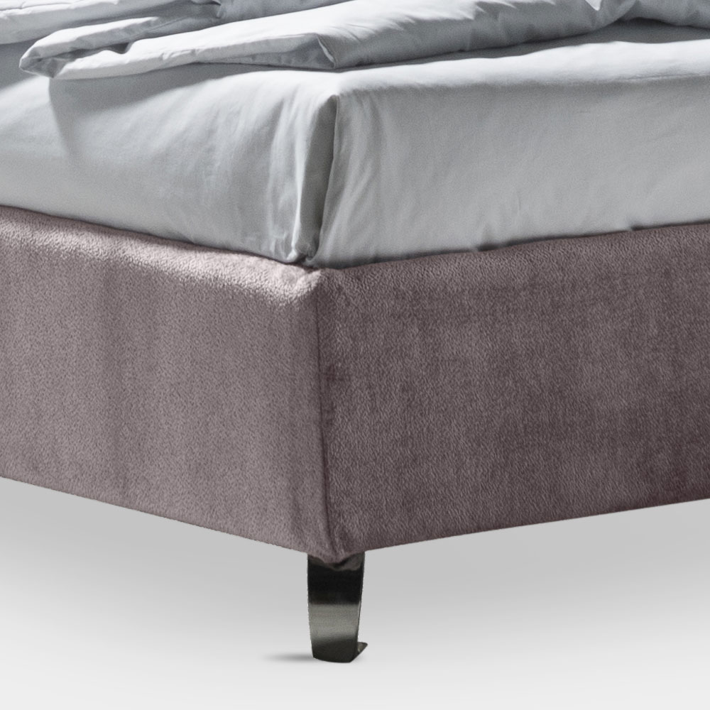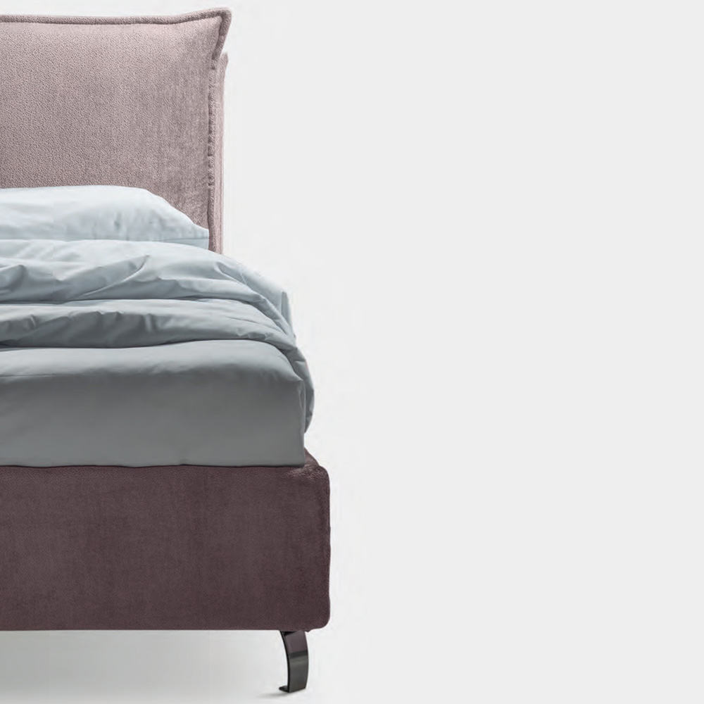 storage box, metal feet with polished steel finish (height 12 cm) and headboard in fireproof fabric, it is made with two soft cushions with a perimeter flounce fixed with practical adhesive Velcro inserts that allow for convenient and easy removal.