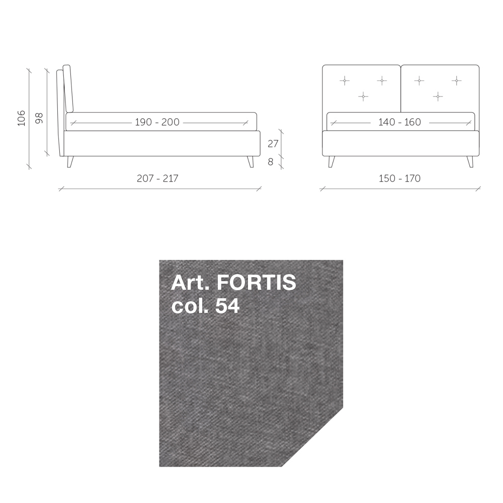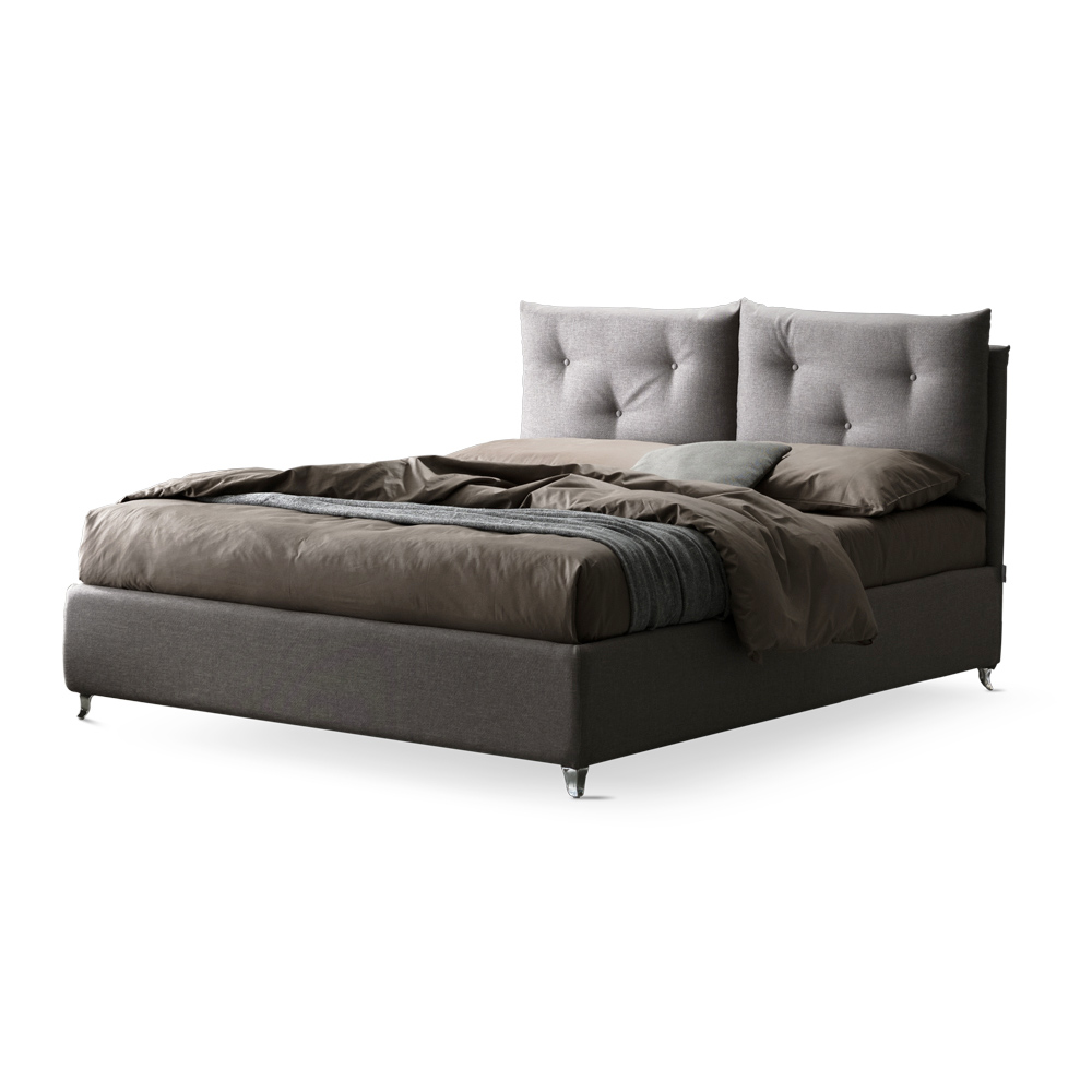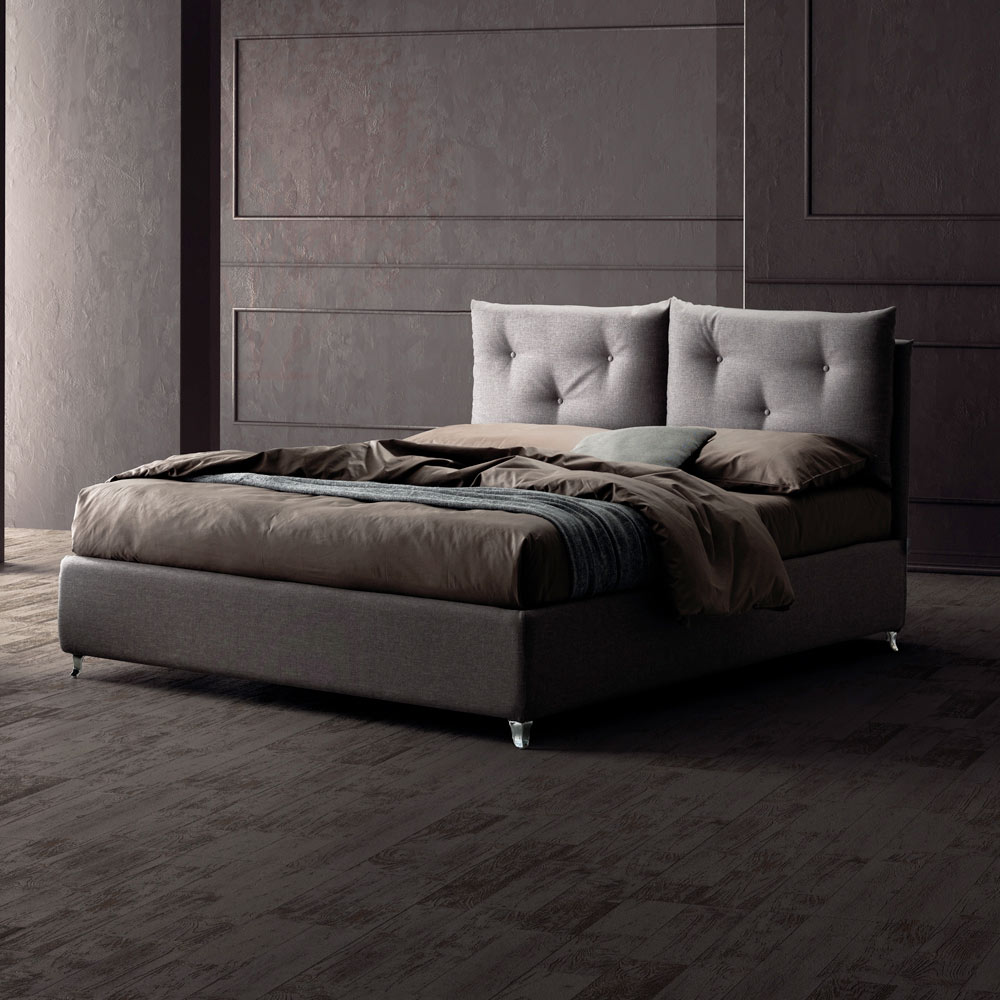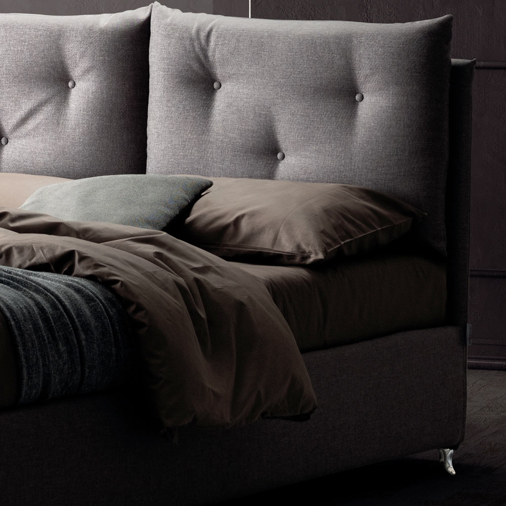 water-repellent and fireproof fabric characterized by the insertion of decorative buttons in the headboard cushions. The cushions are fixed to the frame with practical adhesive Velcro inserts that allow for convenient and easy removal.