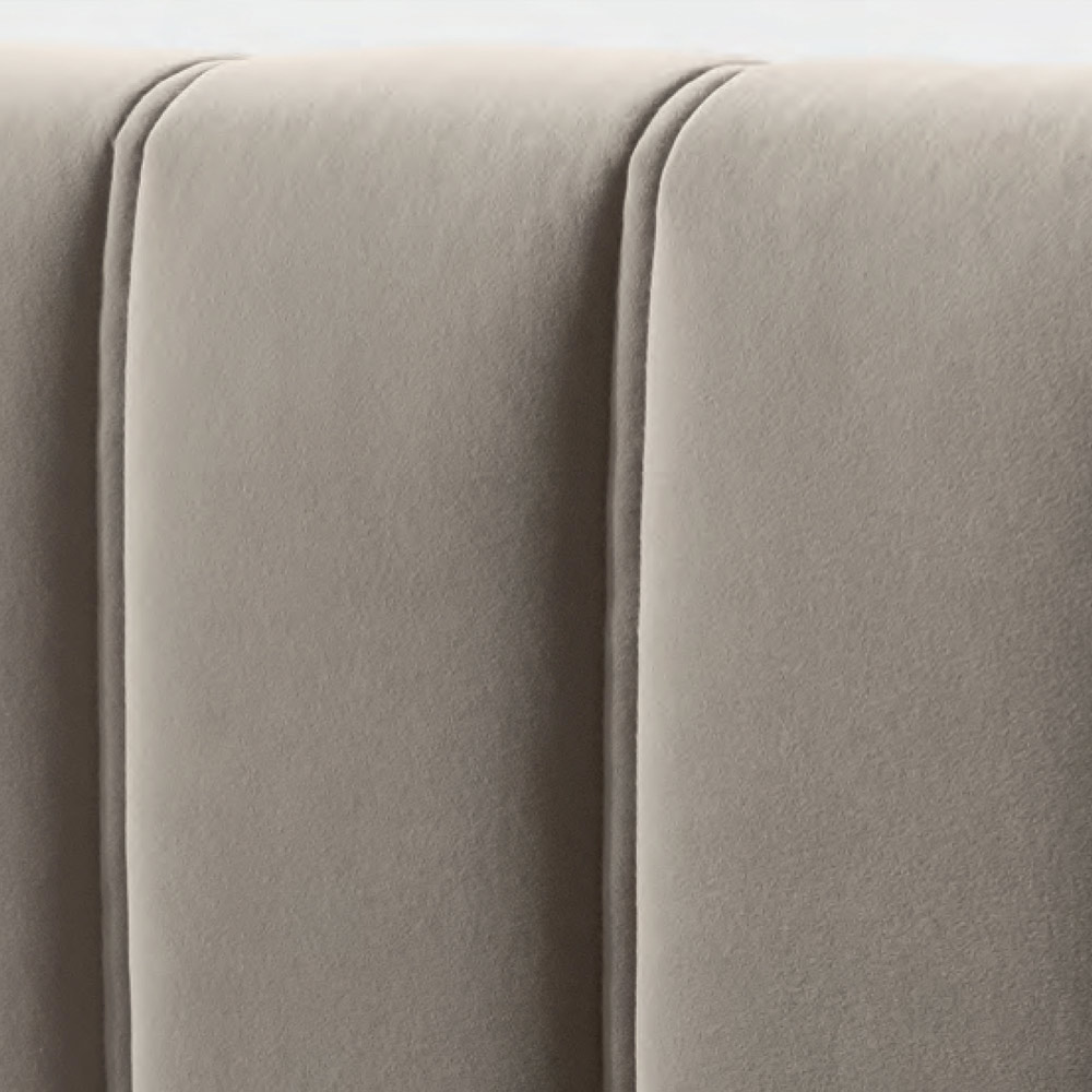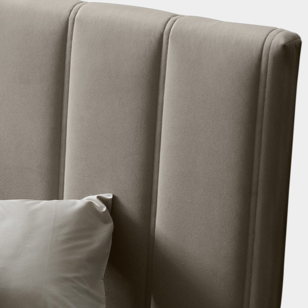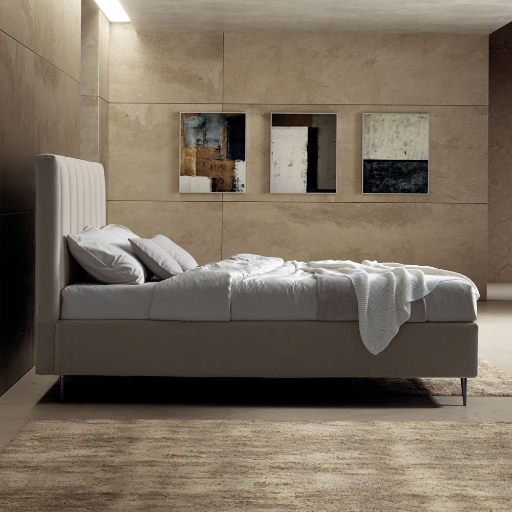 storage box, mocha finish metal feet (height 15 cm) and thick headboard in fireproof fabric, made with a particular quilting process with wide vertical bands that highlights the rigor and clean queues.