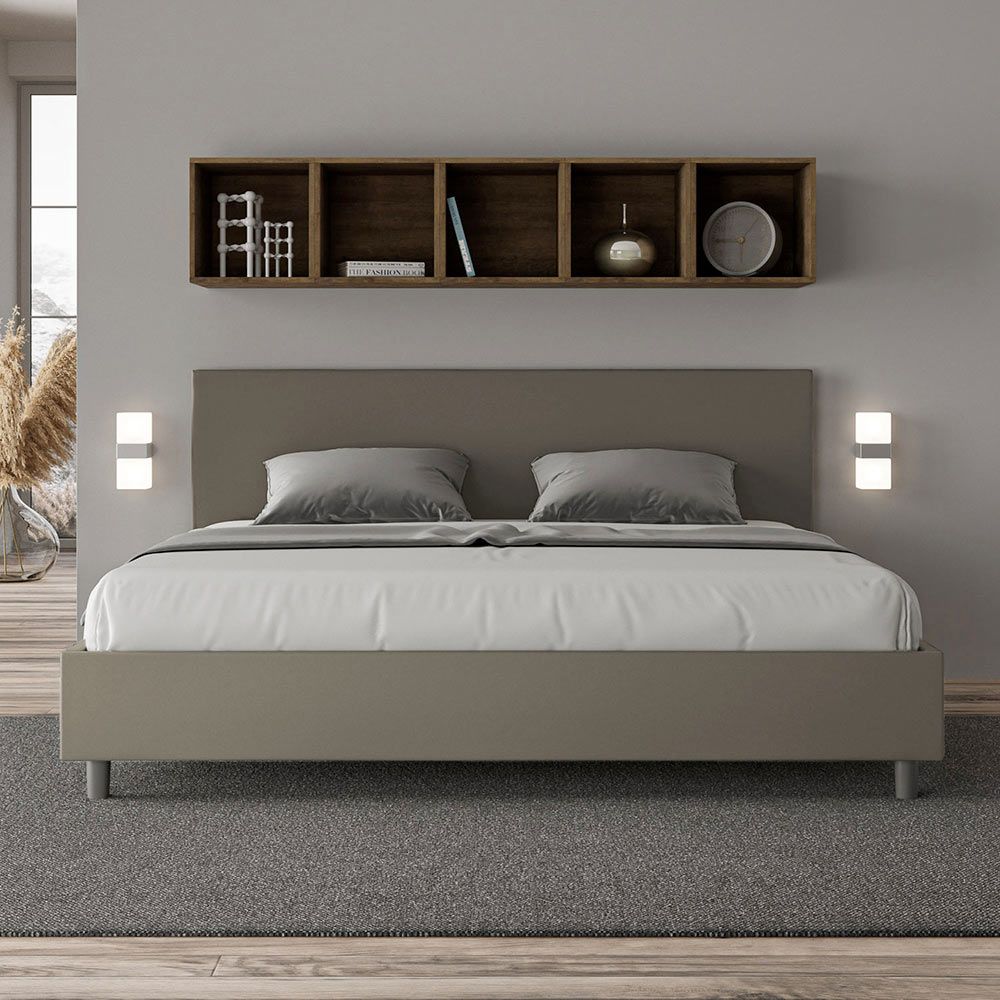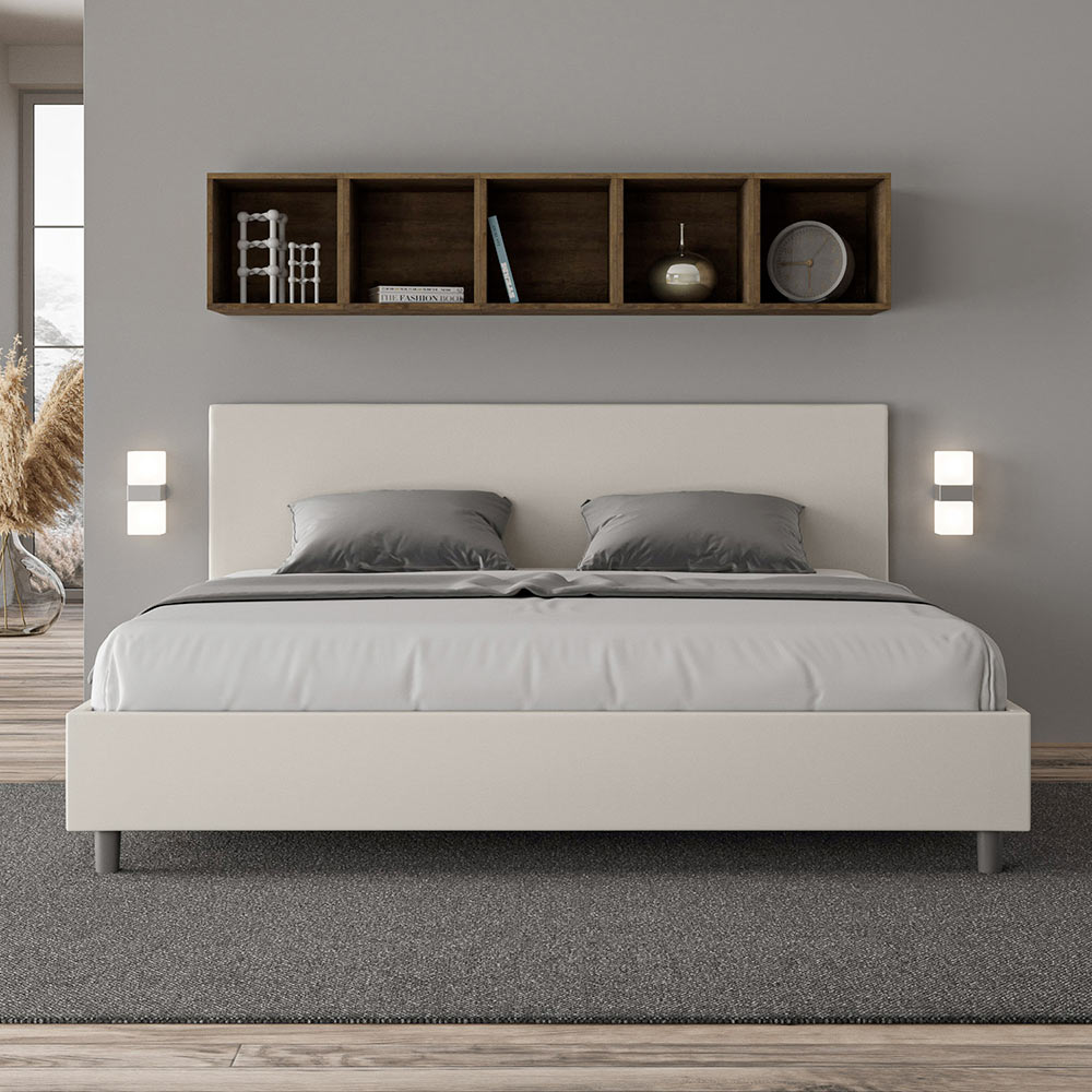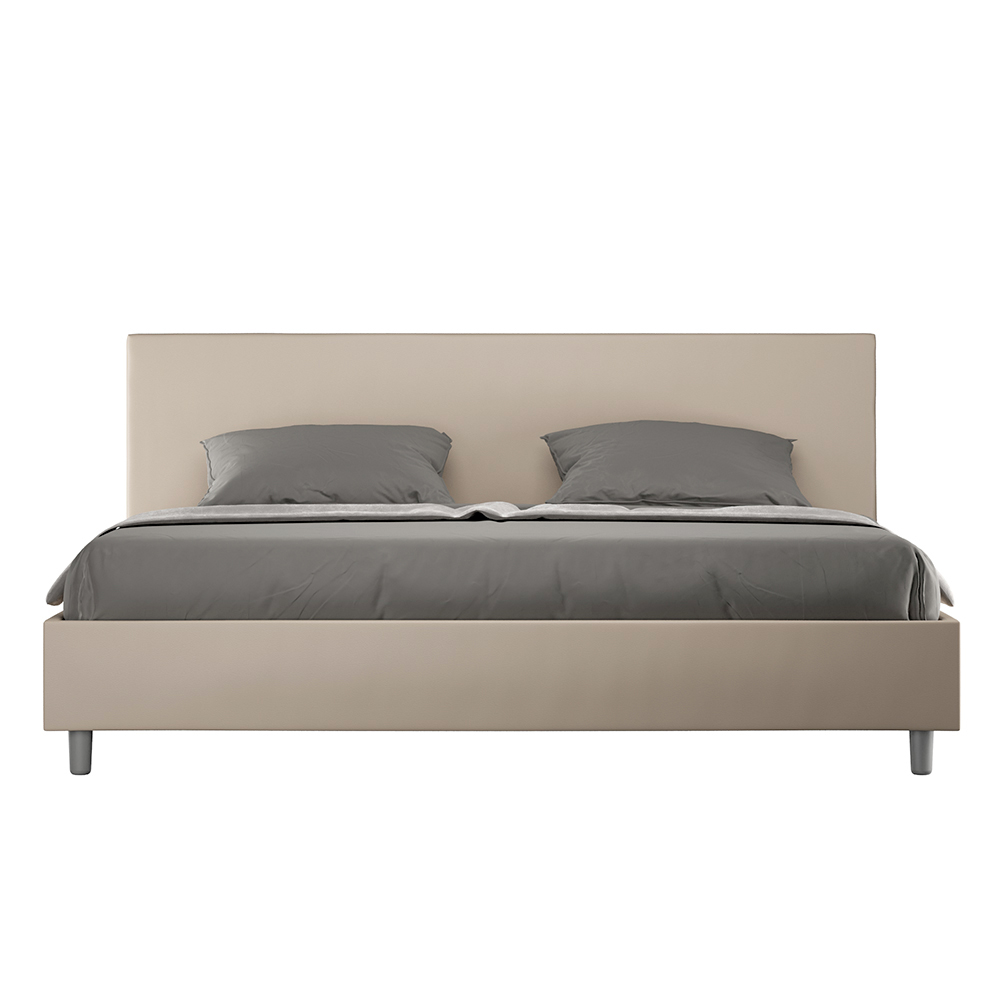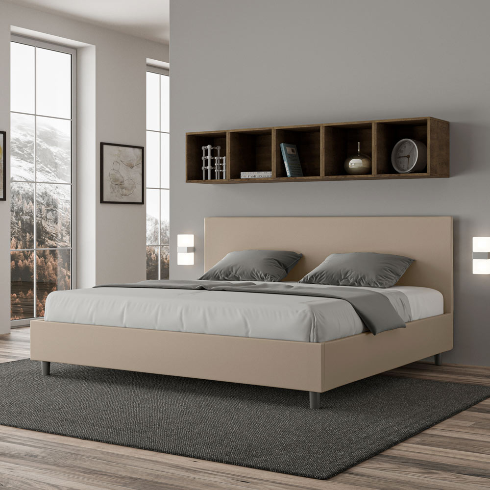 This king-size bed features a padded bed frame and is an icon of understated yet elegant style. Featuring a faux leather headboard , this bed blends seamlessly into any space, adding a distinctive touch of class and luxury, quintessentially Italian. Maintenance is easy: simply wipe it with a microfiber cloth to preserve its beauty over time.