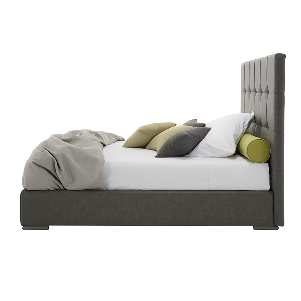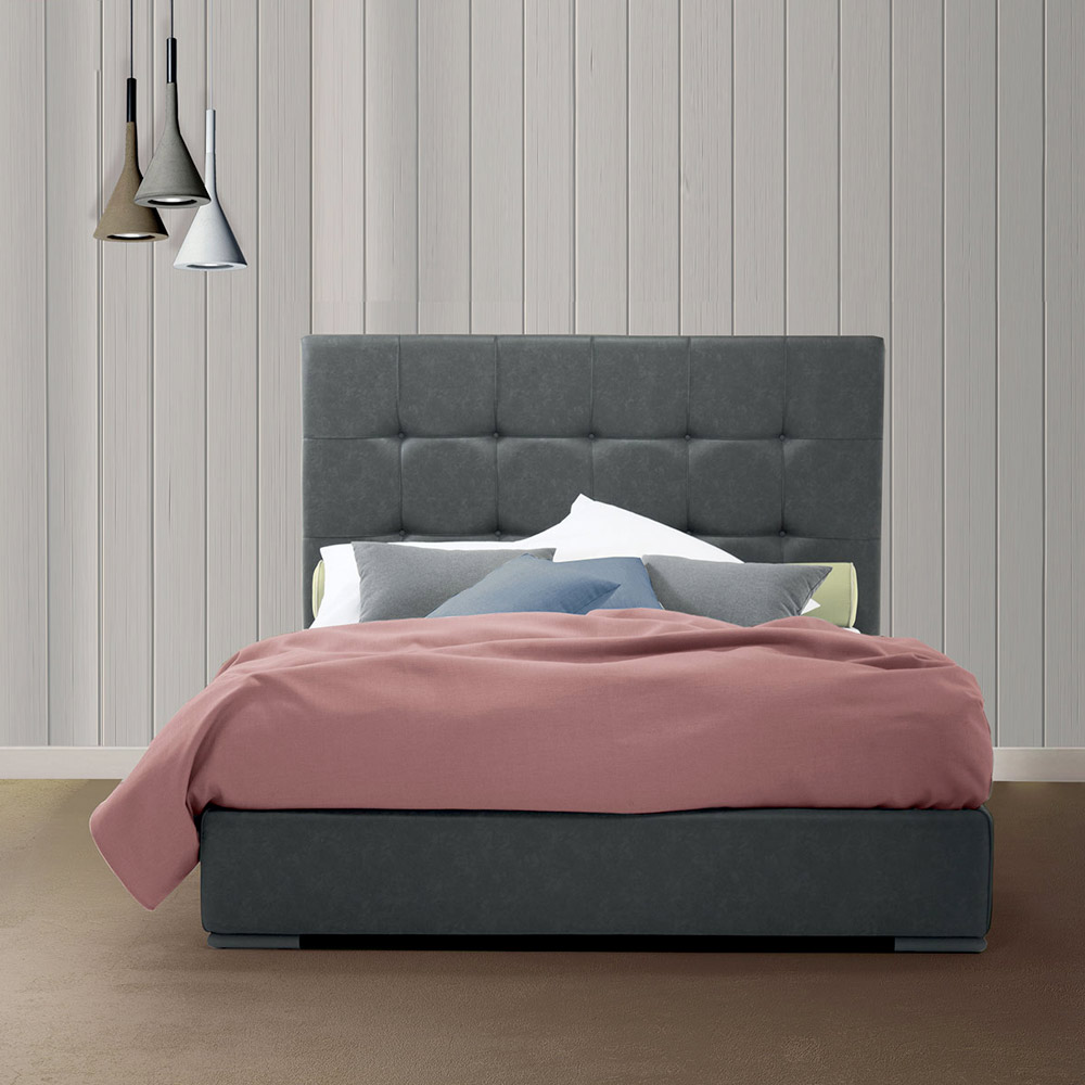 High quality double bed with king size headboard and storage box, handcrafted in Italy in fabric or eco-leather.