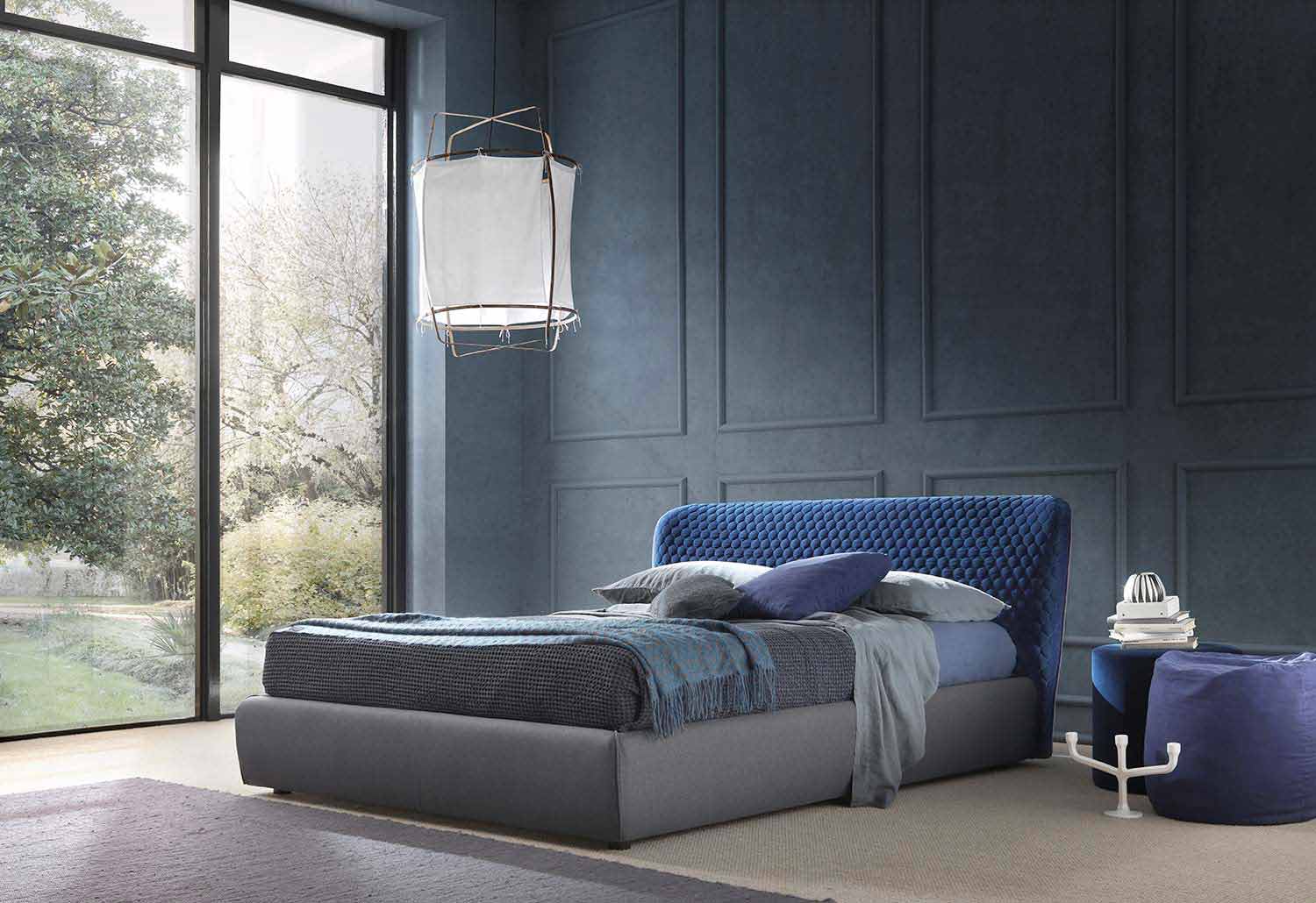 The Corolle double bed with a contemporary design, has a sinuous queue intertwined with an accurate choice of colours. Soft queues, which we also find in the texture of the headboard. The container has a structure in wood agglomerate with a synthetic internal finish with a fir effect, the latter are supported by profiles of expanded polyurethane and tubular