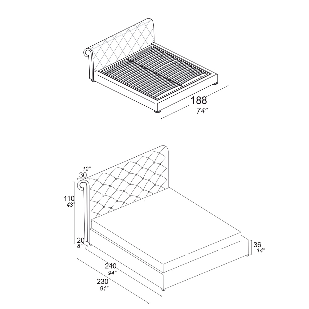 - length: 188 cm x depth: 240 cm x height: 110 cm - suitable for a 160x200 cm mattress