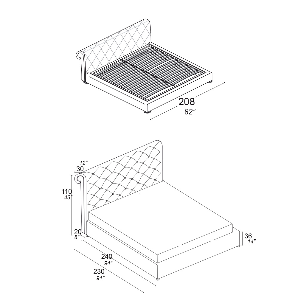 - length: 208 cm x depth: 240 cm x height: 110 cm - suitable for a 180x200 cm mattress