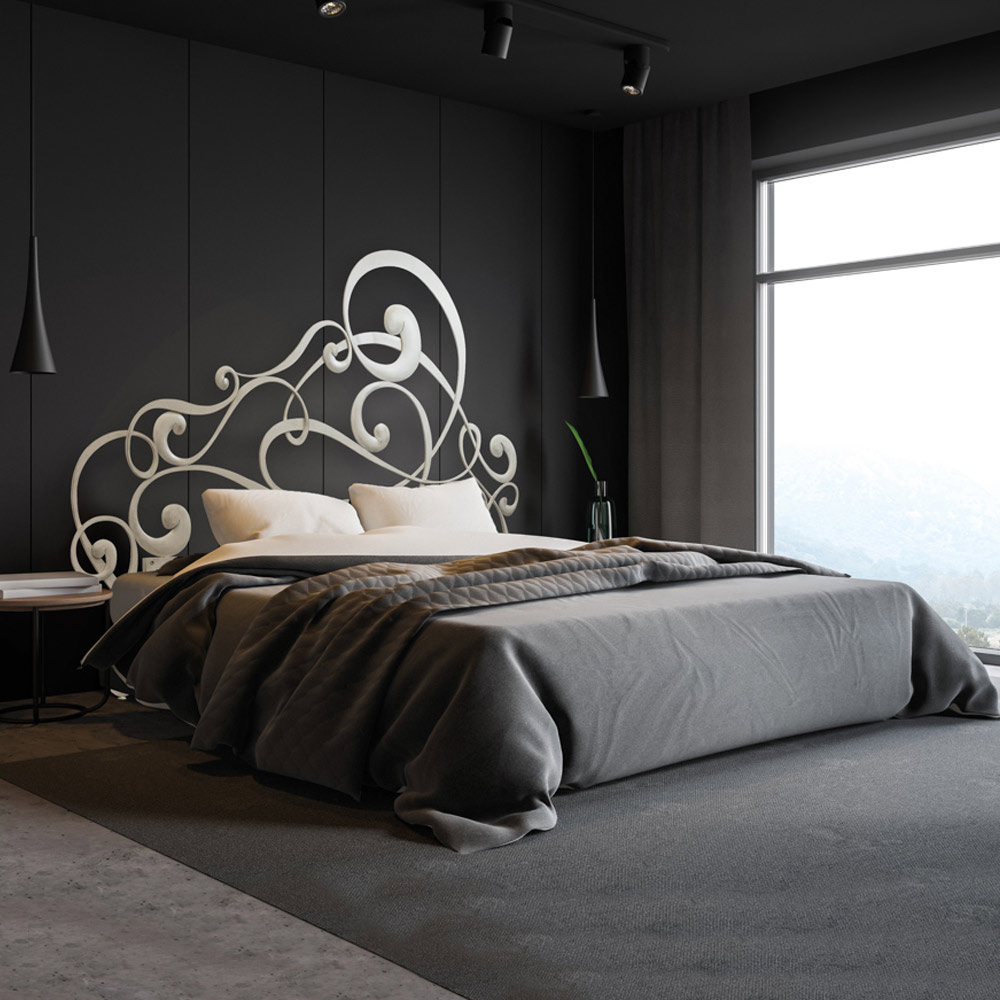Double bed made with headboard and bed frame in 95% solid iron and 5% tubular and powder painted finish.