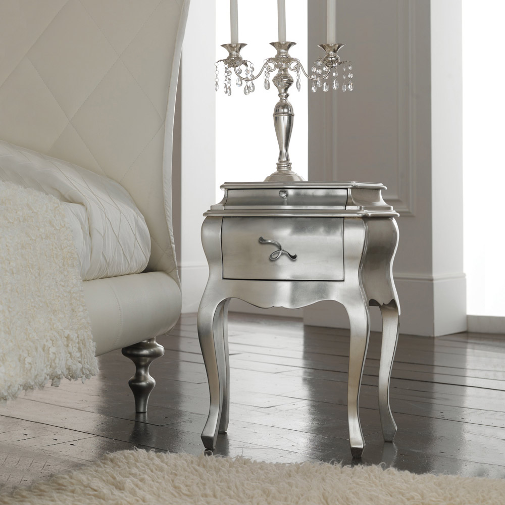 Available finishes:- meccata silver leaf bed, silver leaf bedside tables