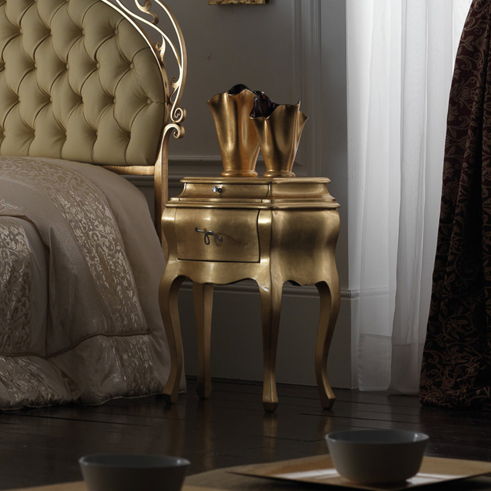 - gold leaf bed, gold bedside tables