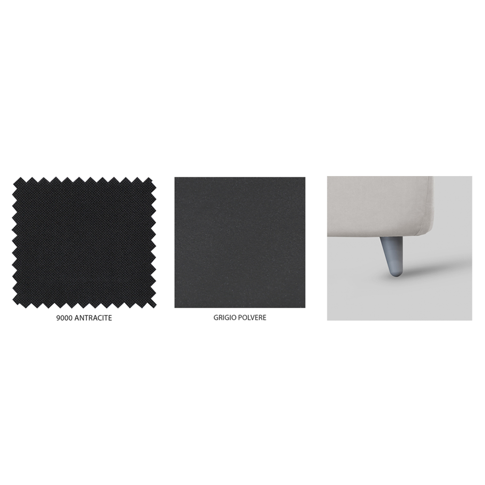 covered in anthracite colored fabric with grey polypropylene feet.