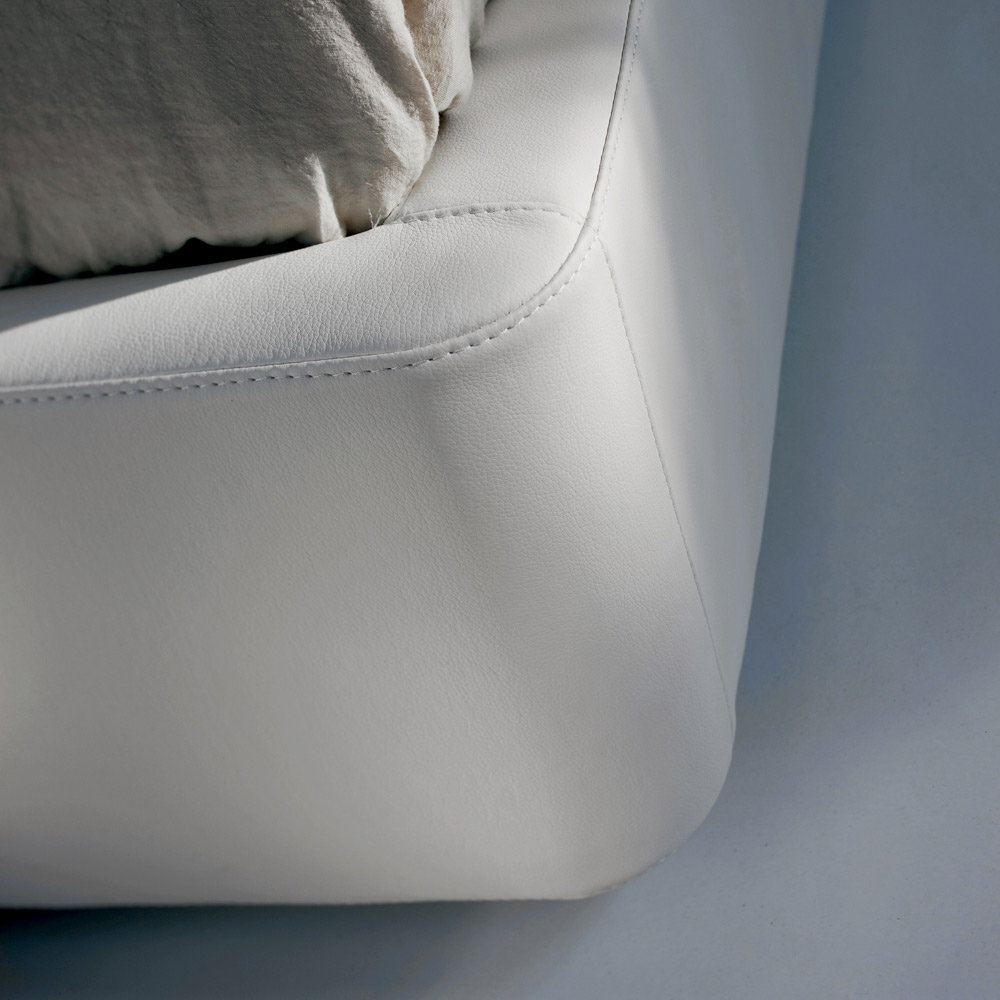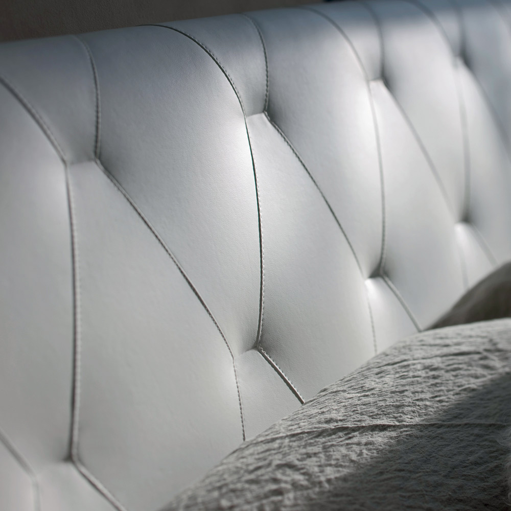 The bed is a masterpiece of modern design that promises both aesthetics and comfort. Its geometric padded headboard is a focal point, offering comfortable support and adding a dimension of contemporary style to the room. The sturdy frame of the bed ensures durability, while the high-quality faux leather upholstery emphasises the elegant look. The thin and refined legs complete the design, giving the bed a modern and sophisticated presence. It is the ideal choice for those who want a touch of modernity combined with comfort in their bedroom.