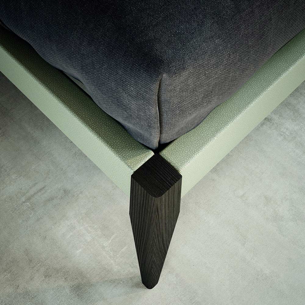 visual balance between the abundant volumes of the headboard, enriched by the particular central stitching, and the sober and essential queues of the bed frame. The elements that surround it are combined with it, creating a