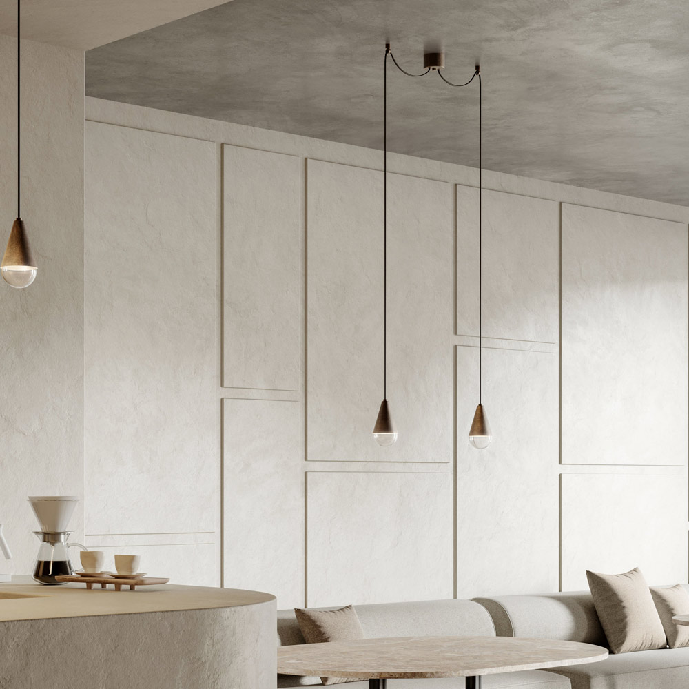 Made in Italy. The clean queues of the collection of indoor lamps highlight the purity of the iron material. The pendant element can be used alone or in combination with others, to create linear compositions or groupings with a scenographic effect.