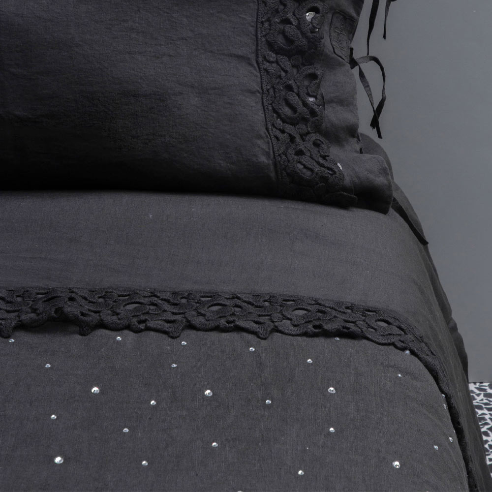Double duvet cover in black linen with crystals, buttons and luxury flap made in Italy.