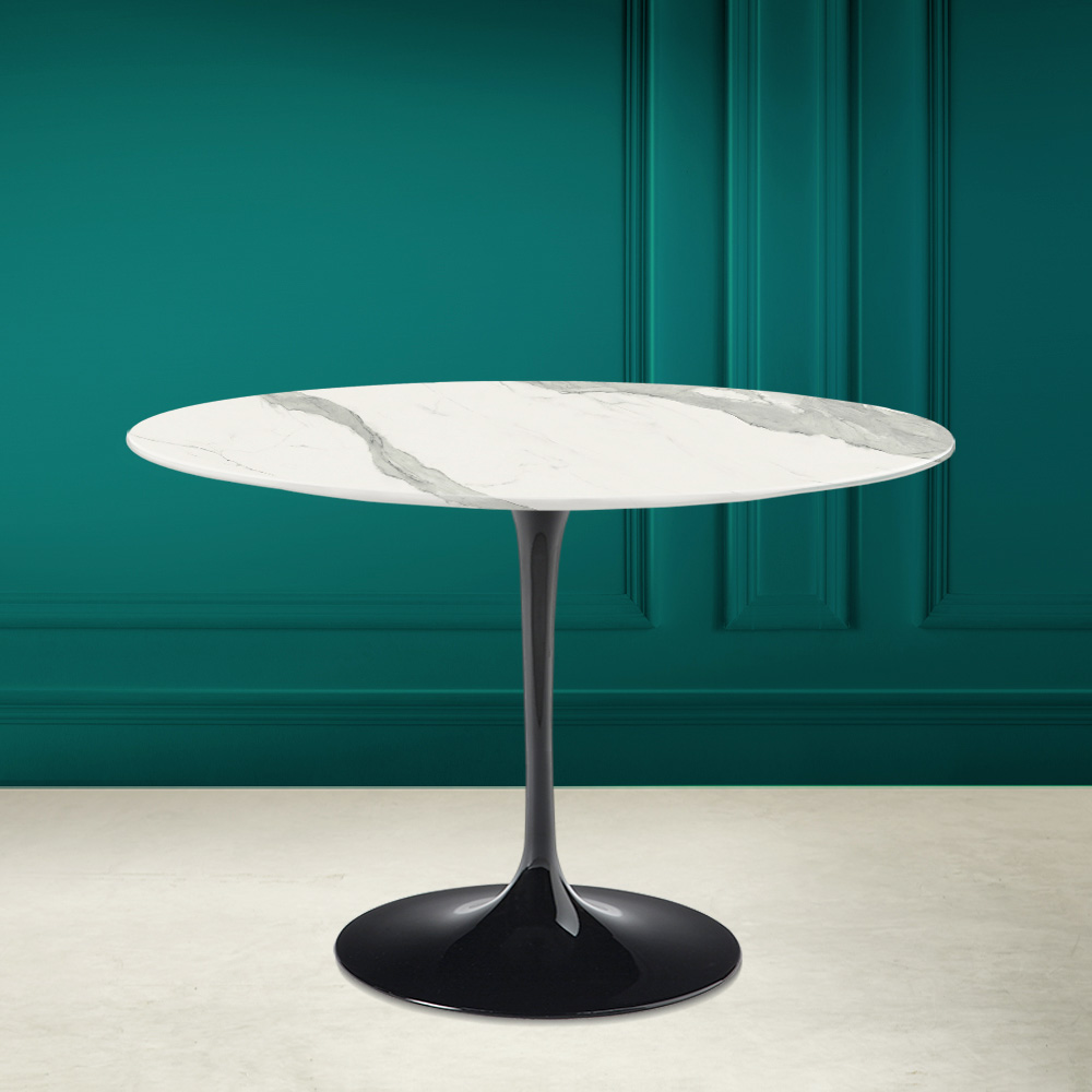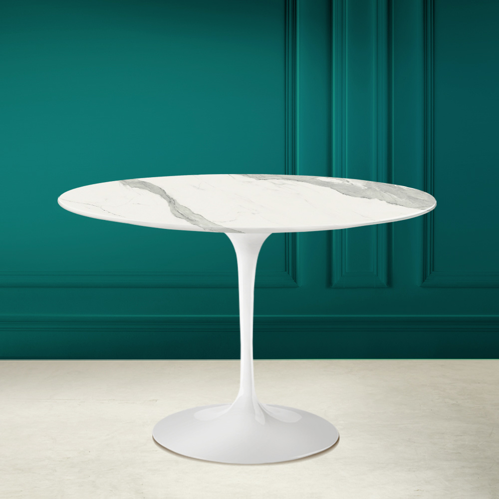 Dining table with round top in statuary full vein ceramic and polished aluminium base Made in Italy