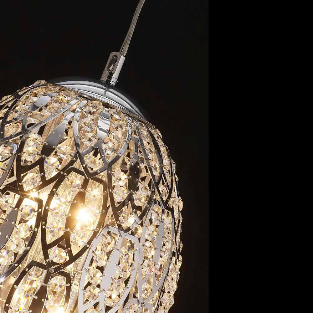 Elegant egg-shaped crystal pendant lamp Egg, unique design. The lamp is made from the welding of several pieces of steel mesh, with a chrome-plated finish.