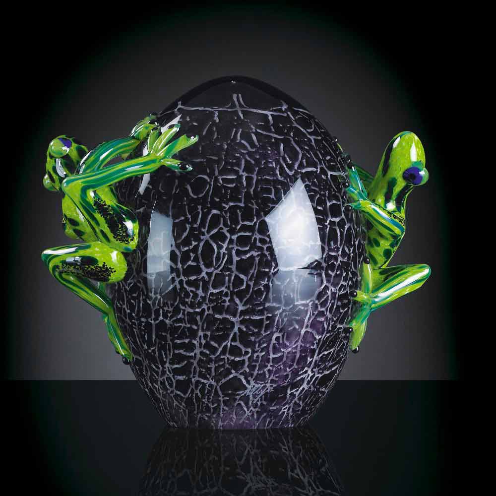 Decorative statue in the shape of frogs on an egg made in Italy in black and green glass . A furnishing accessory with intrinsic elegance that combines the timeless refinement of glass with bright and lively colours that give the product an original touch and underline its value and value. The wonderful finishes and the new and creative shapes enrich this ornament allowing it to prove to be a perfect solution for those looking for a creative and eccentric style for their home suitable for giving life to exclusive atmospheres .