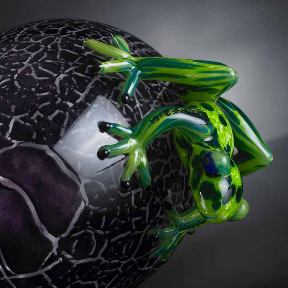 Decorative statue in the shape of frogs on an egg in colored glass Made in Italy.