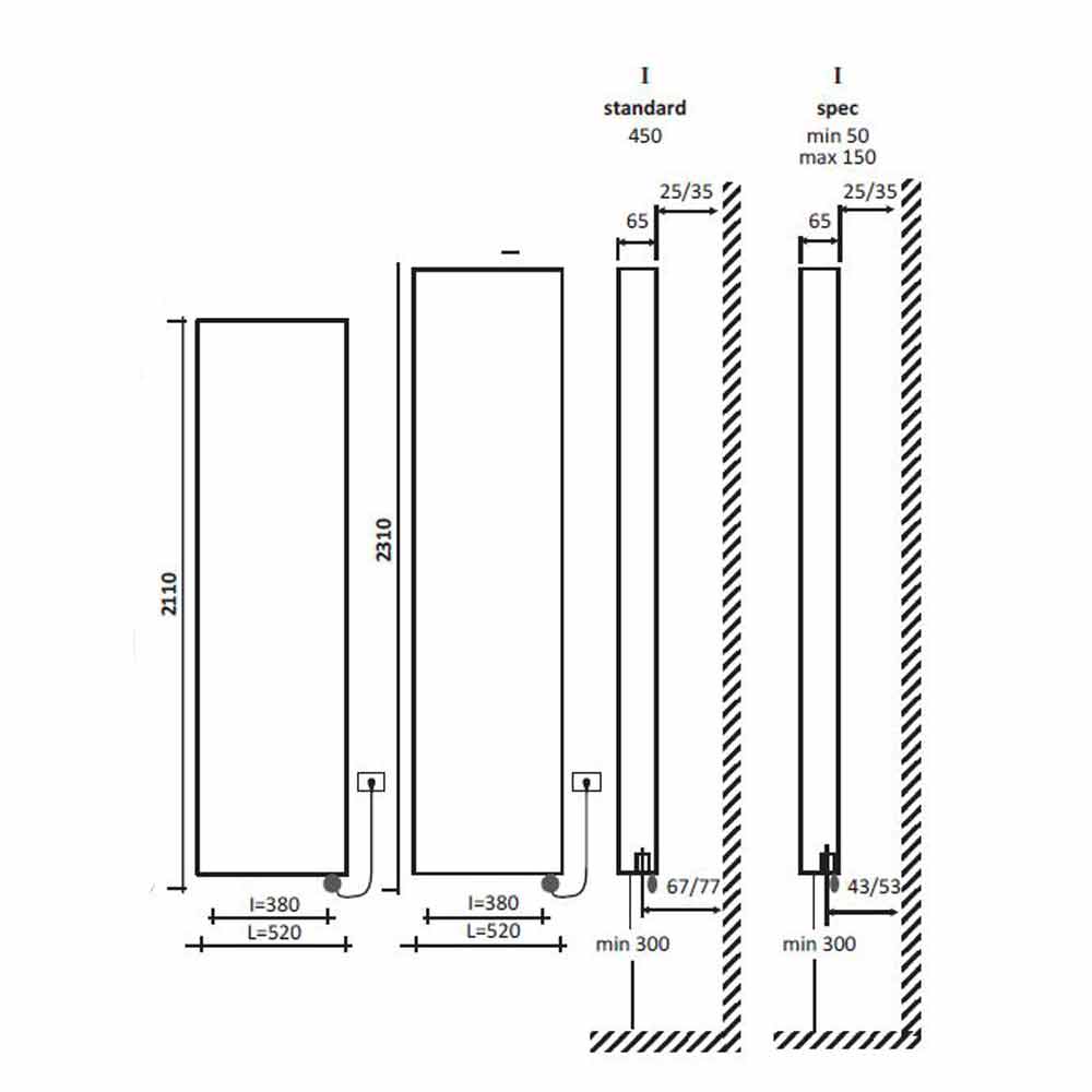 - H 1800 x L 520 x Inter. 450 x P 65 mm x Output w 700