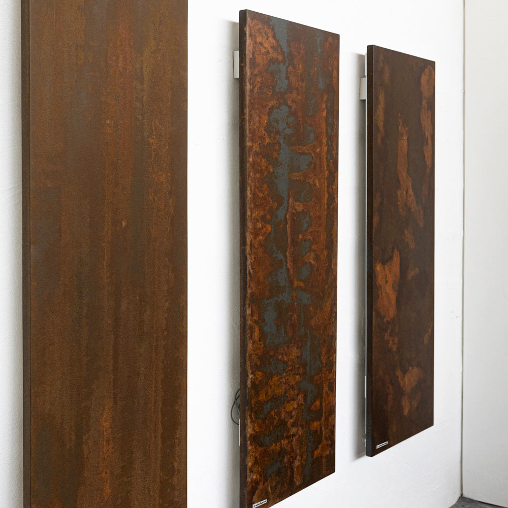 After a second nebulization phase to reactivate the reaction again, a treatment based on a special paint finally follows to protect the radiator. The final result that emerges from the processing phases is therefore a surface with the typical non-homogeneous colour of corten which combines the light and dark of rust for an original and harmonious play of colours.