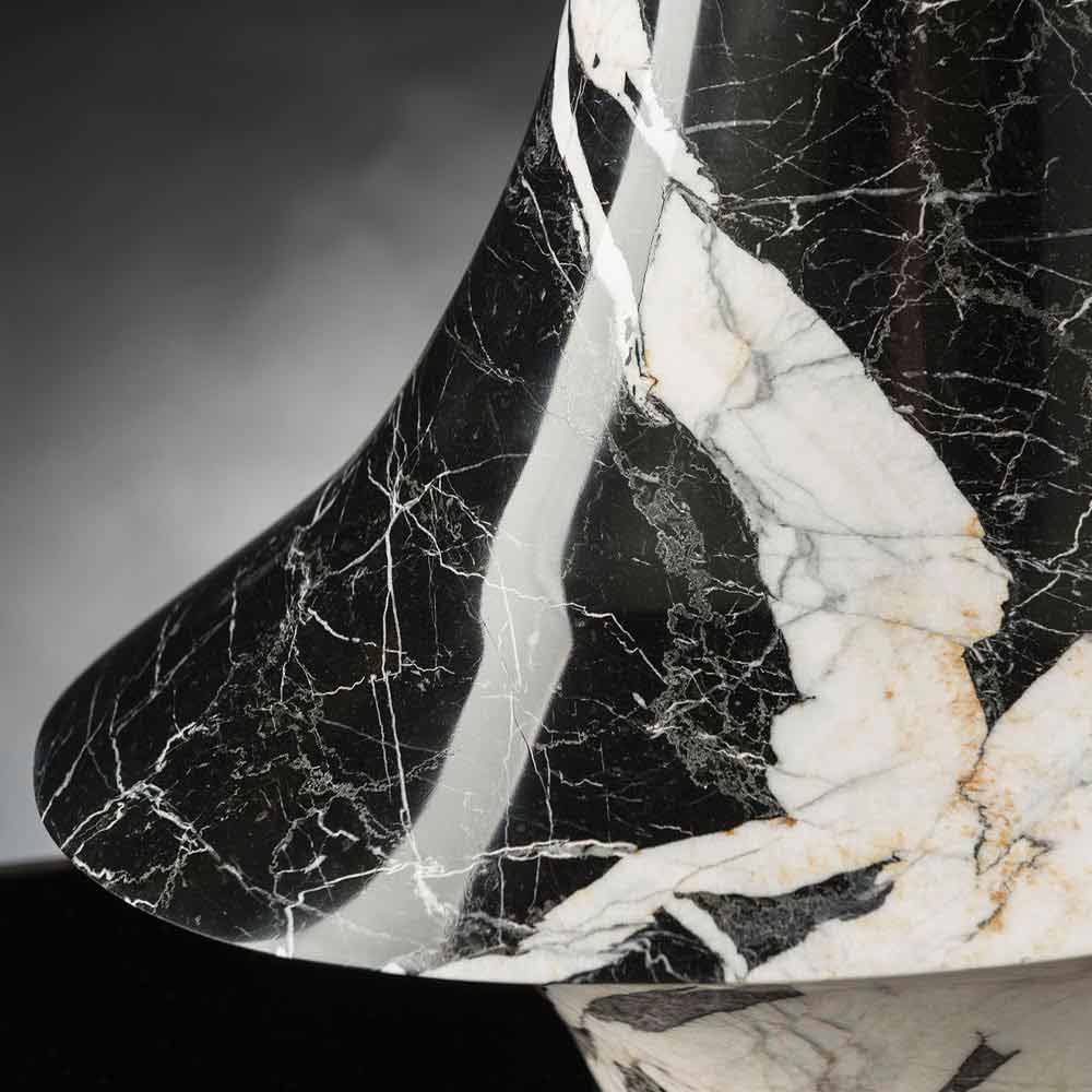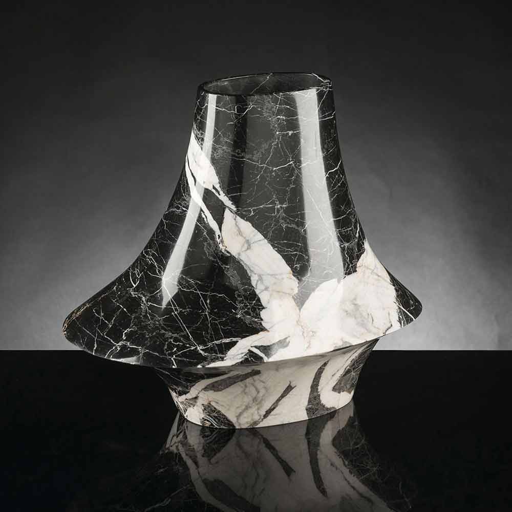 Indoor ornamental vase made of black marble with white veins through a 100% Made in Italy production . Its production takes place through the processing of natural stones with 5-axis pantographs that allow to obtain more complex shapes than simple rotation volumes. This elegant piece of furniture comes from the union between the study of natural phenomena and the interaction of the materials used with human technology to give life to a unique and avant-garde style of furniture. The result is an exclusive decorative element capable of enriching any environment with a modern and refined aesthetic with personality. An ideal style for the most varied environments, from home furnishings to that of hotels, restaurants, contract areas, spas but also as a setting for events and weddings.
