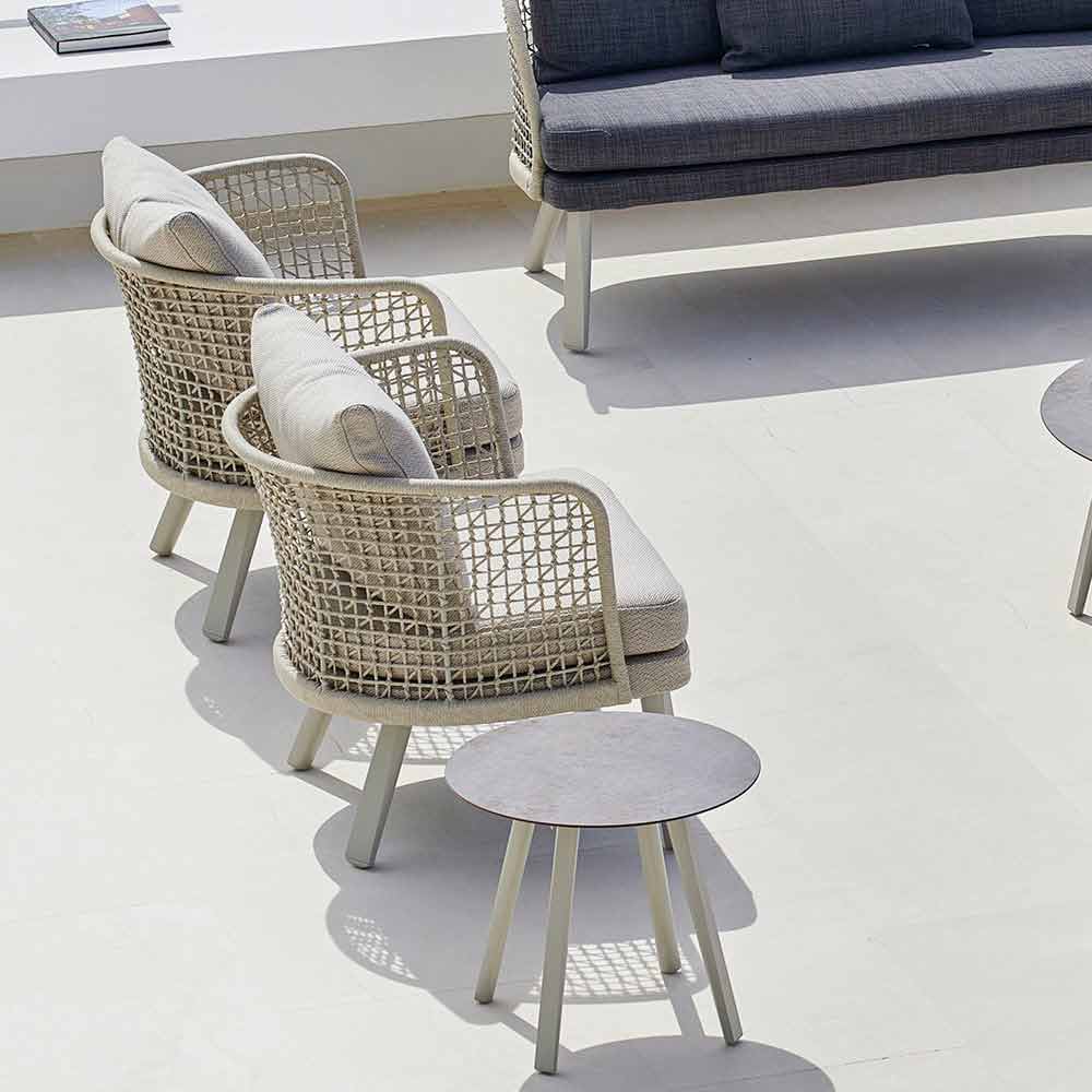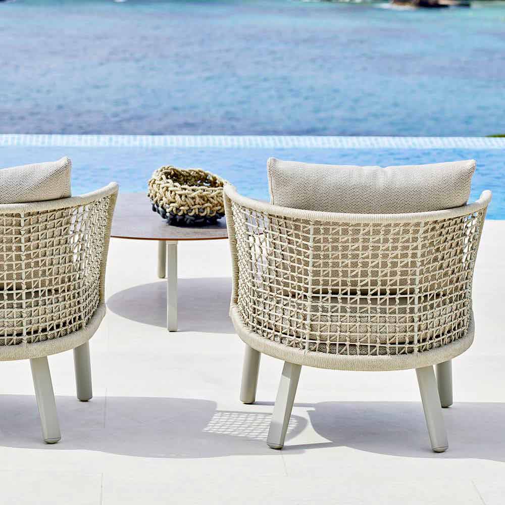 Emma is a magnificent garden armchair characterized by a structure in synthetic fibre hand-woven with beige powder coated aluminium frame.