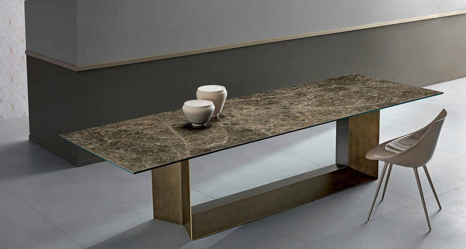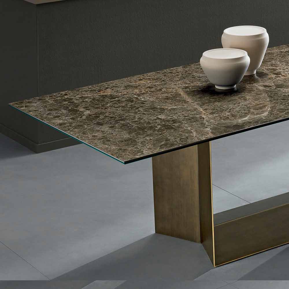 Luxury kitchen table with polished Emperador ceramic top and brushed bronze metal base, made in Italy.
