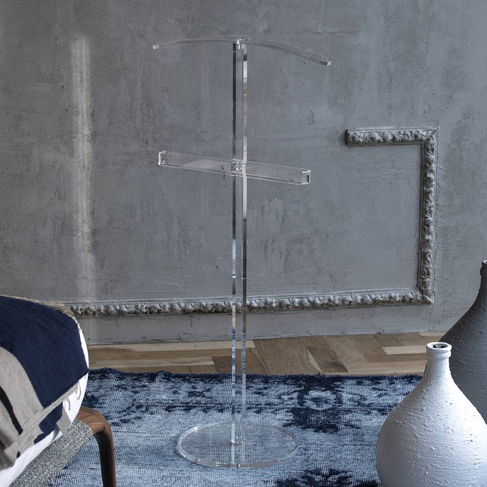 Made entirely of clear acrylic crystal with an 8mm thick coat hanger and a 25mm thick square trouser rod, it features a round base of 30cm in diameter and 15mm in thickness.