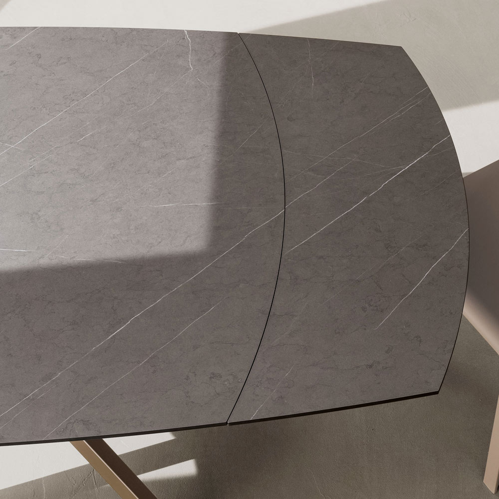 The HPL top is elegant and resistant . Thanks to the extension mechanism , the table extends easily and fluidly, going from a compact shape to a wider one, perfect for welcoming guests in comfort.