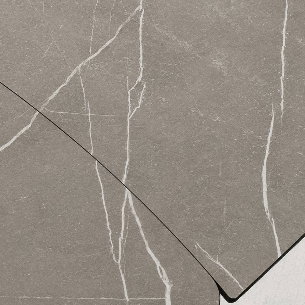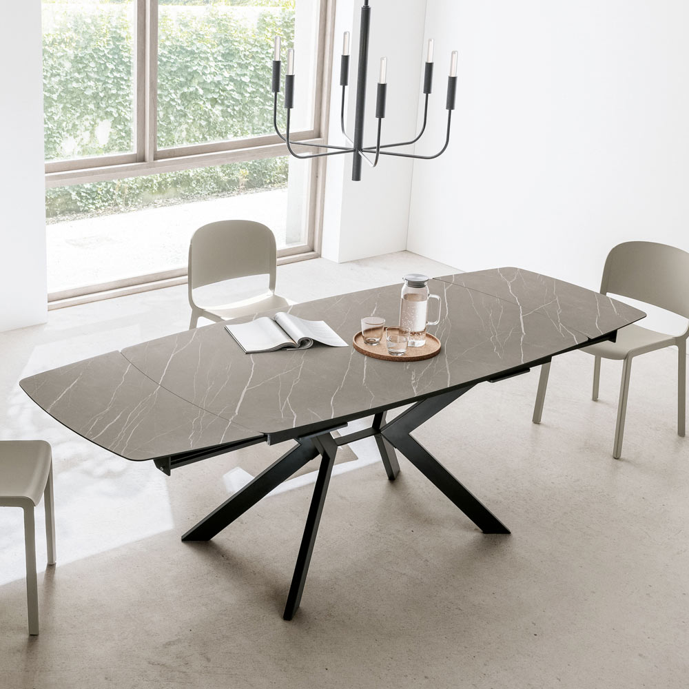 The HPL top with veining offers a refined and natural aesthetic, with a resistant surface, ideal for everyday use. Thanks to the extension system with lateral extensions , the table extends with extreme ease, adapting to family lunches or evenings with chinas.