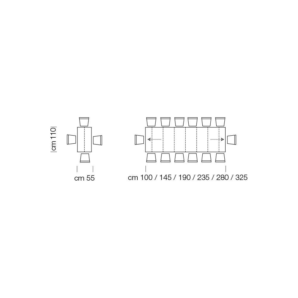 - L 55 (325) x D 110 x H 73.5 cm 14 seater extendable with six external extensions of 45cm each.