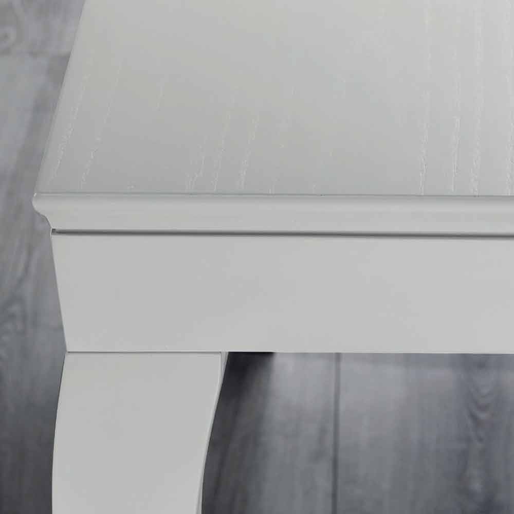 open pore lacquered ral 9002 (grey white). The top becomes extendable through a central opening with aluminium guides and central stand; in the middle can be inserted 5 shelves of 53 cm each contained in a separate