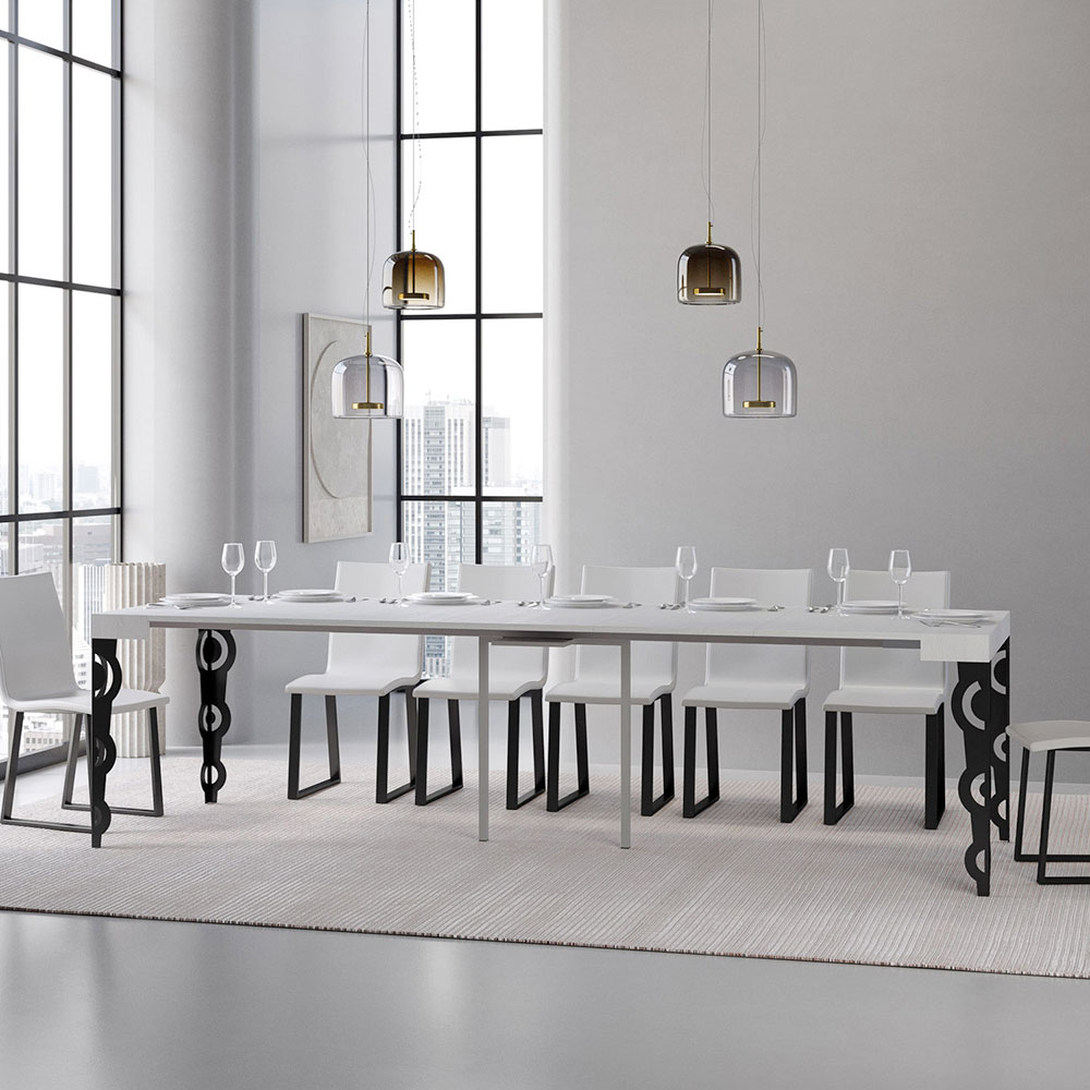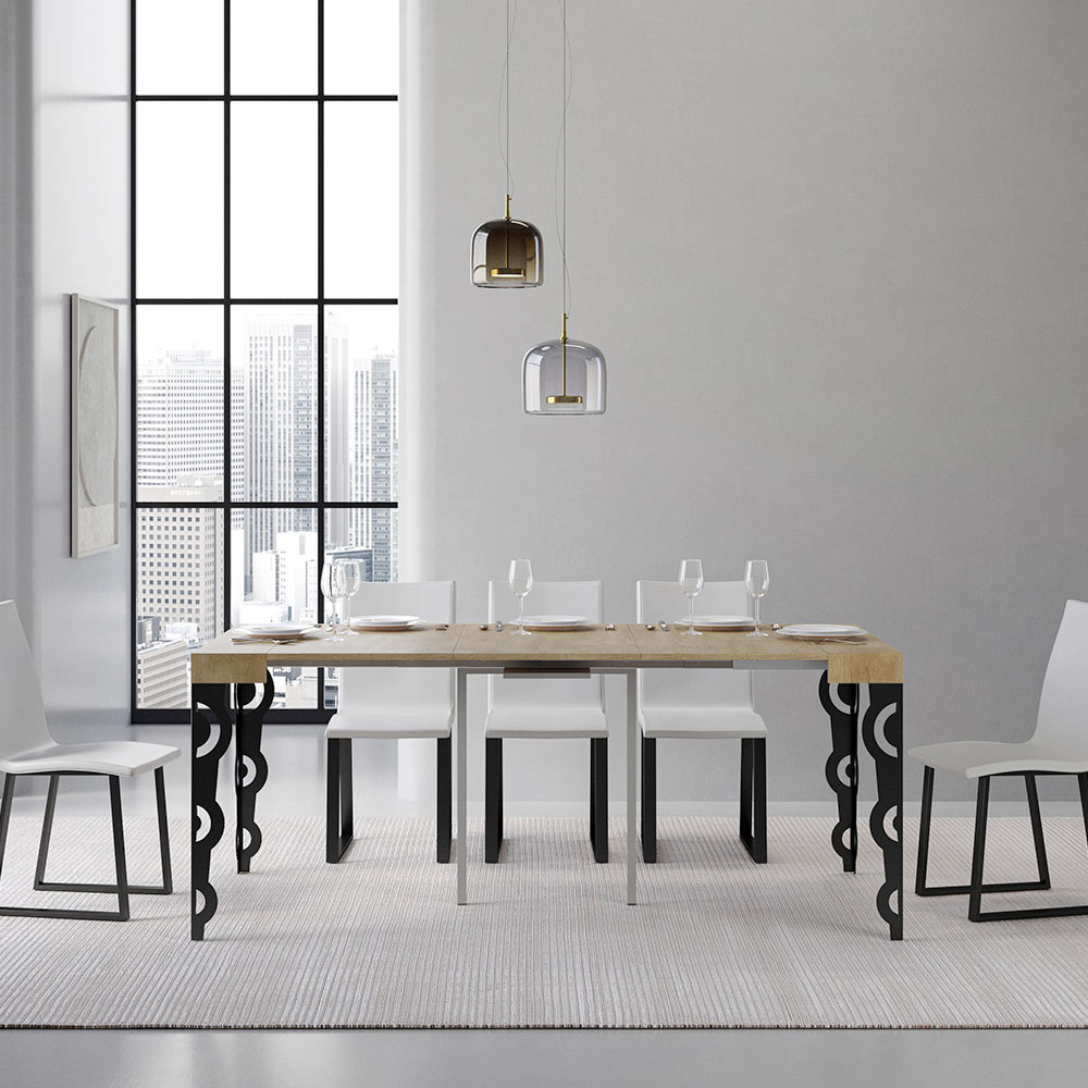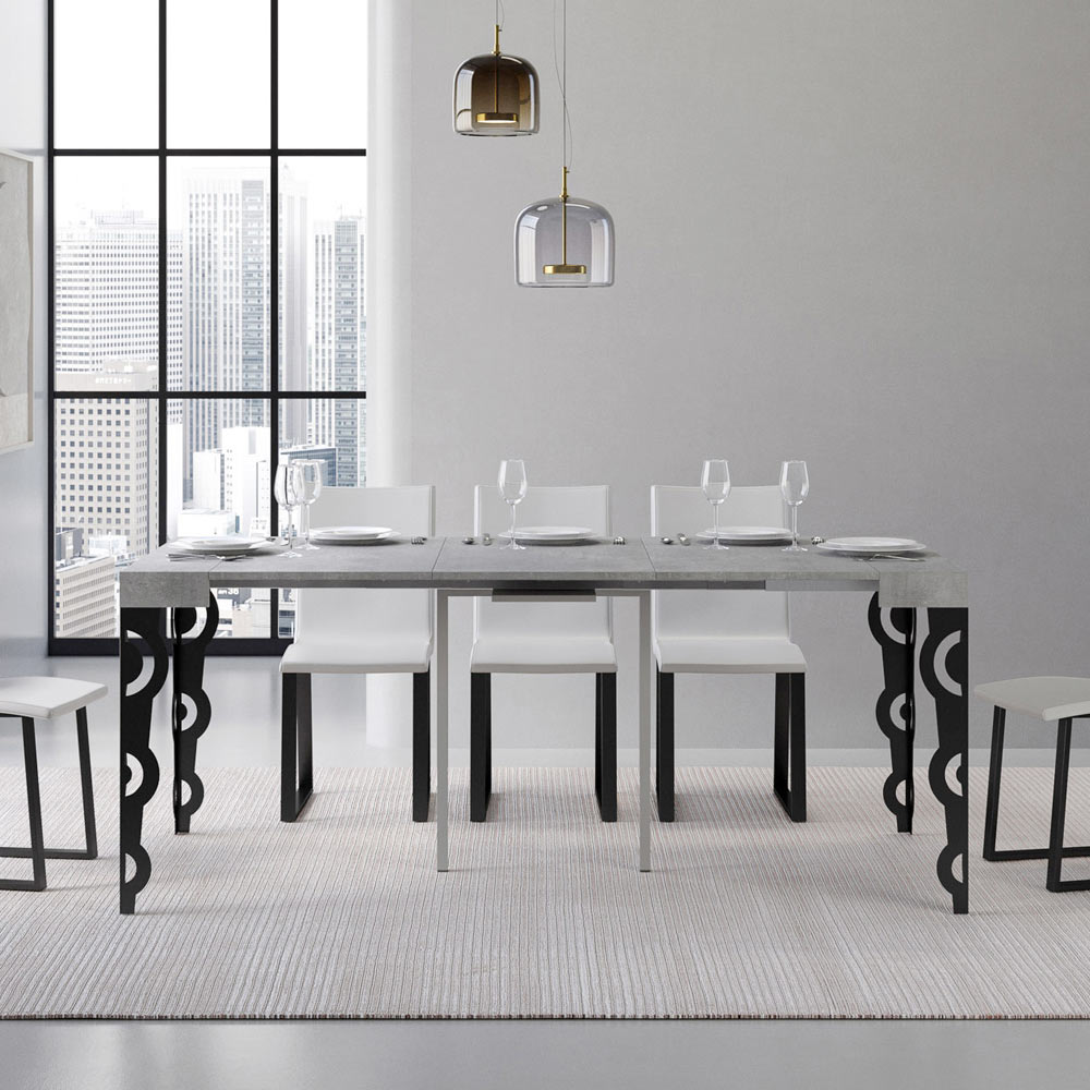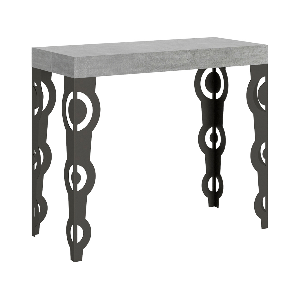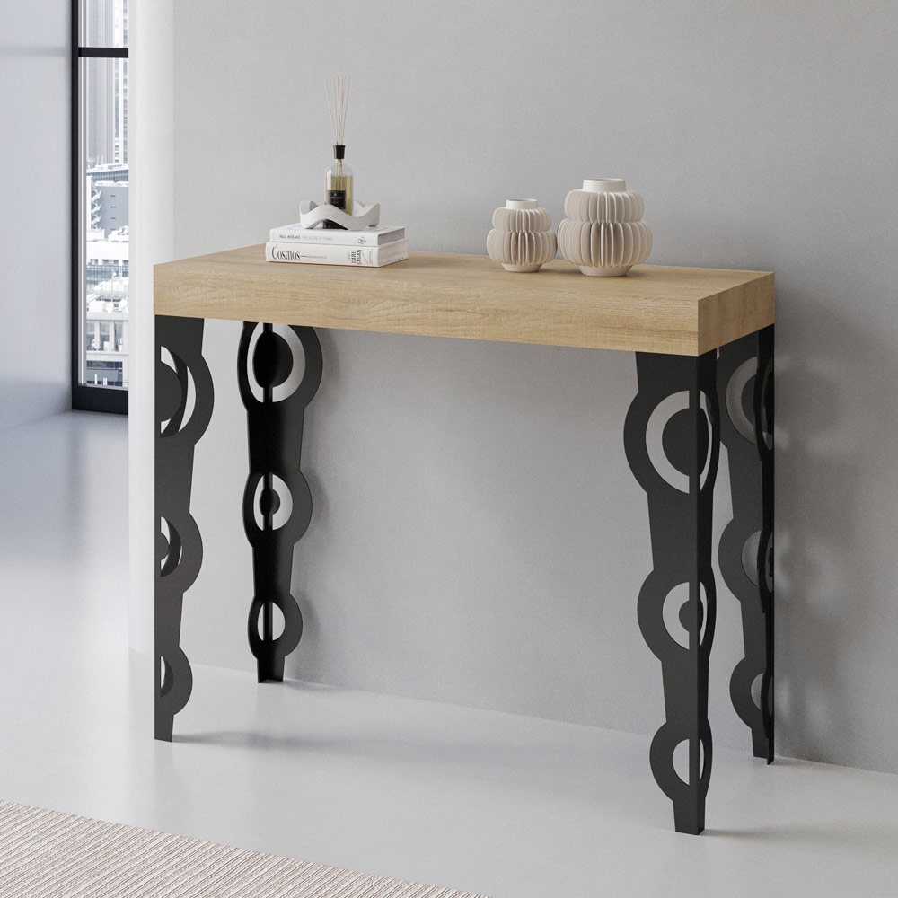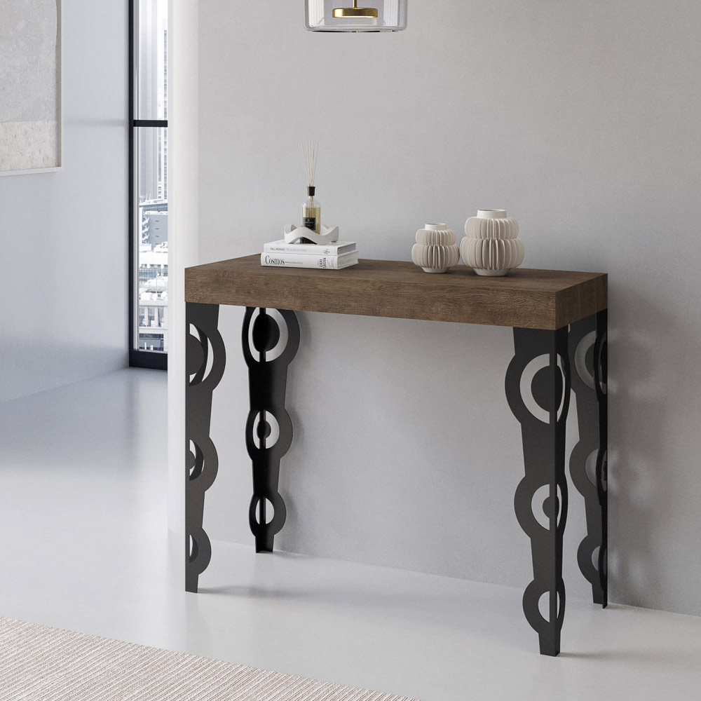 This extending console table è a bold statement of style and design. Its top gives it a urban and modern feel, while the sculpted legs feature an intricate pattern reminiscent of Art Decò works of art, giving the piece a distinct personality and visual appeal.
