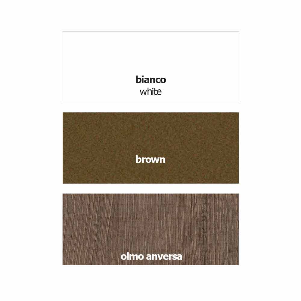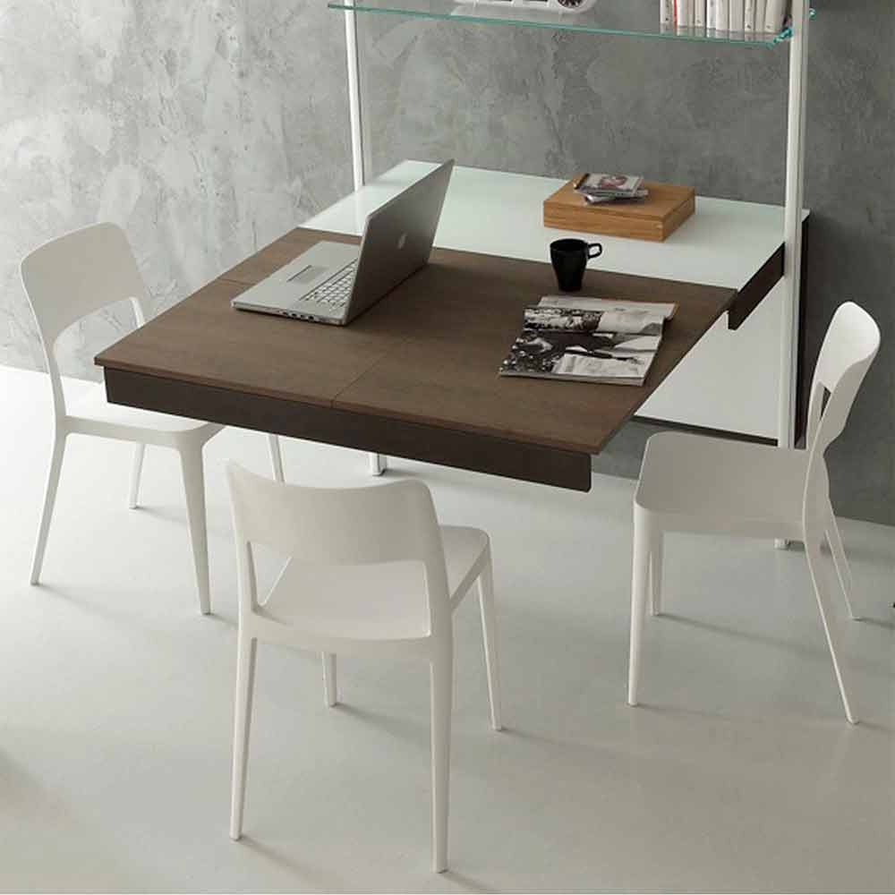 Extendable console with wall mounting made in Italy with glossy white glass top equipped with cable guides and 45 cm extension in elm finish melamine , structure in brown painted metal and removable vertical panel in white plexiglass .