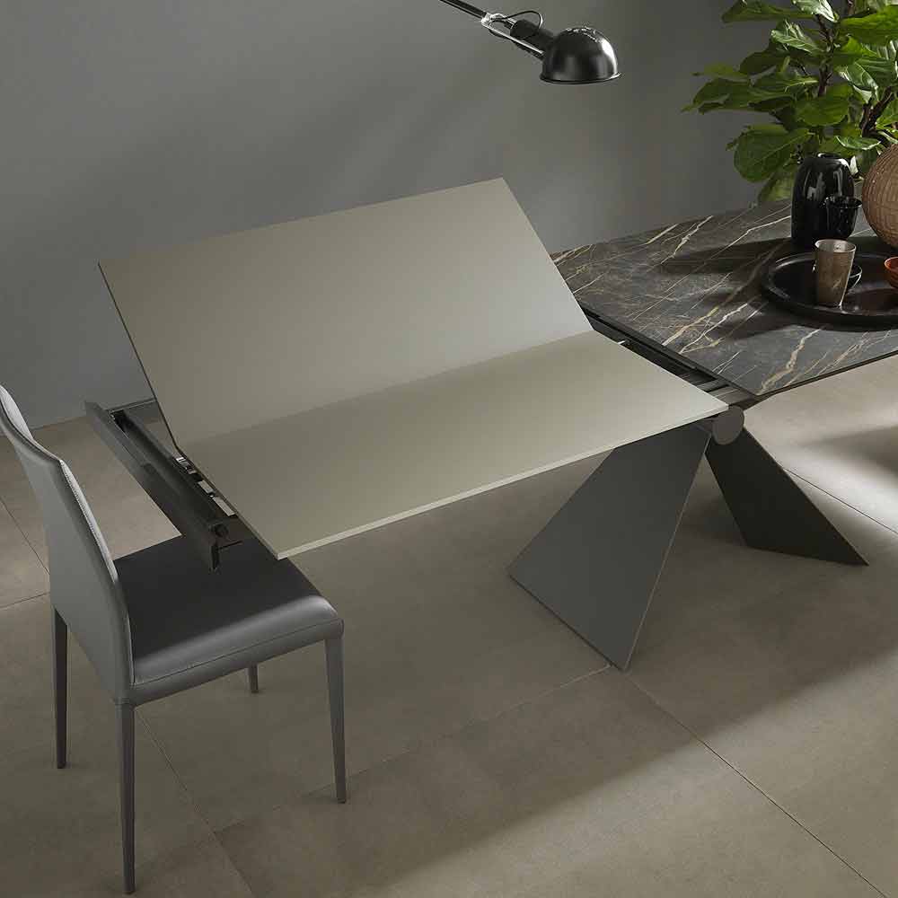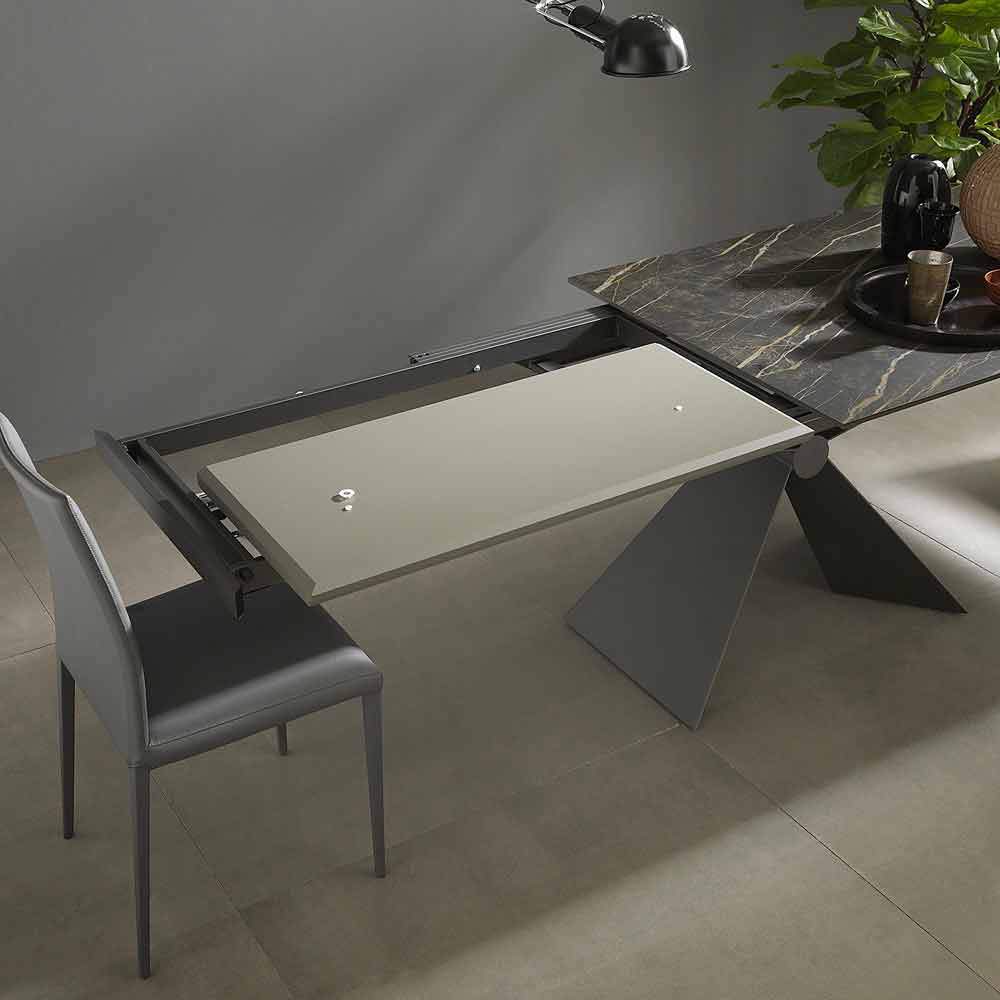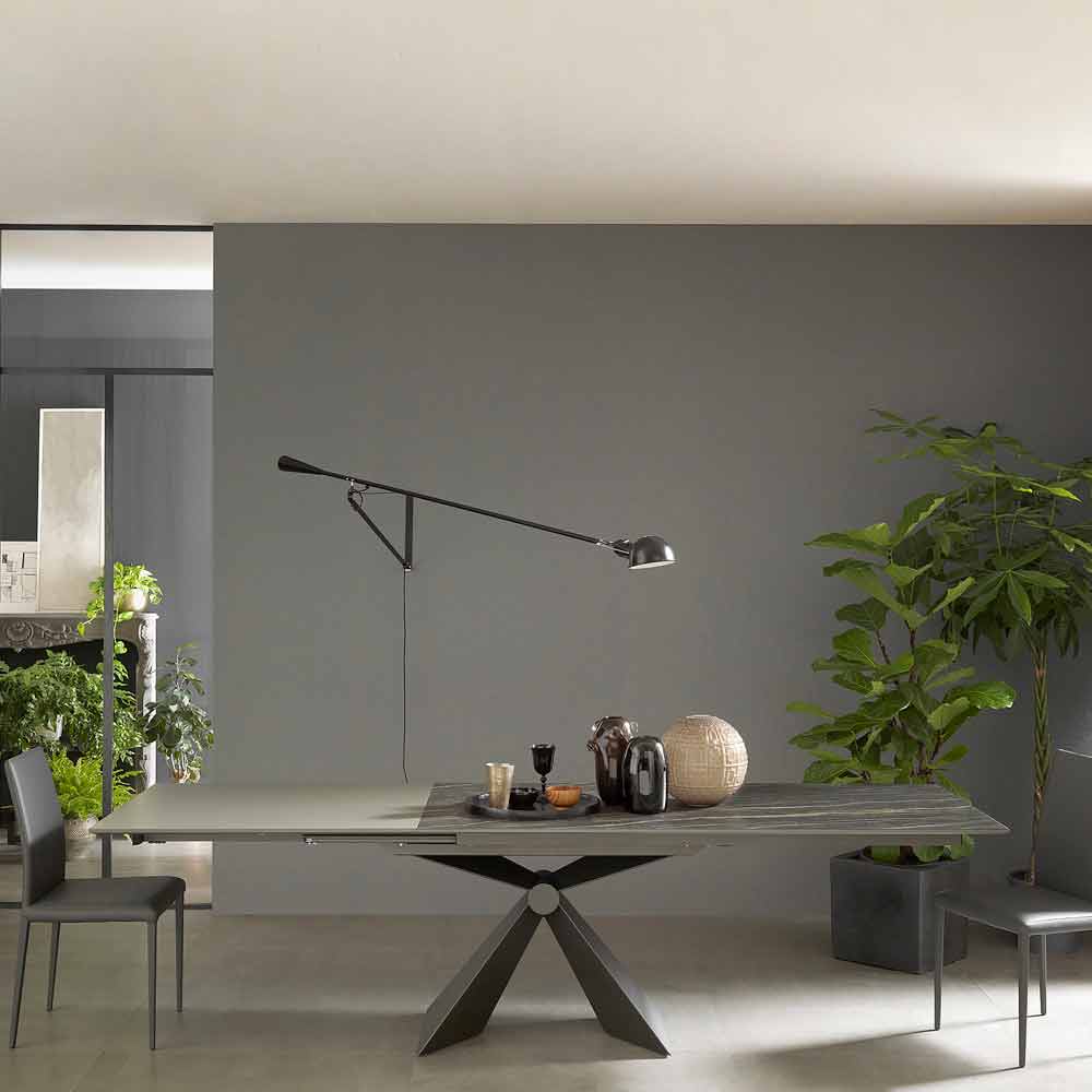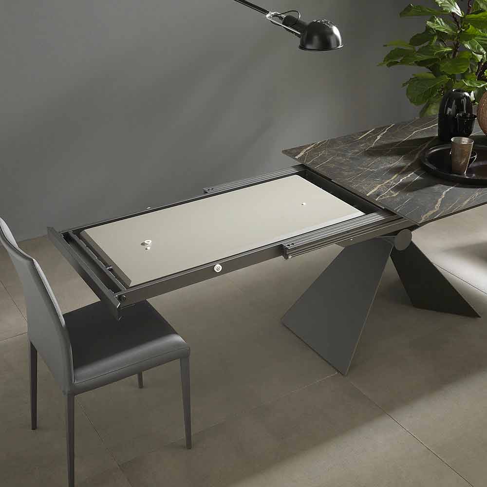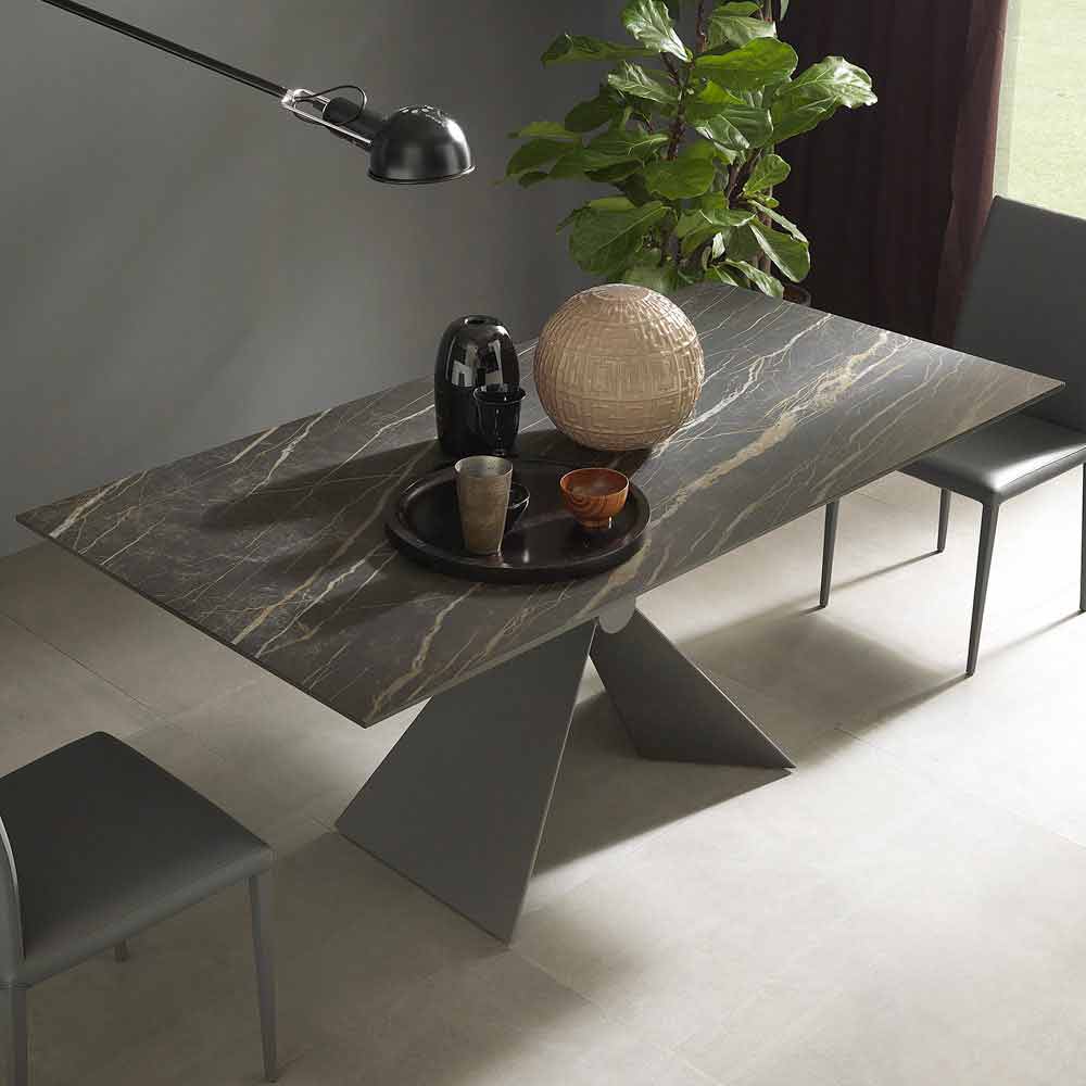 Extendable dining table base with metal knot and ceramic top made in Italy.