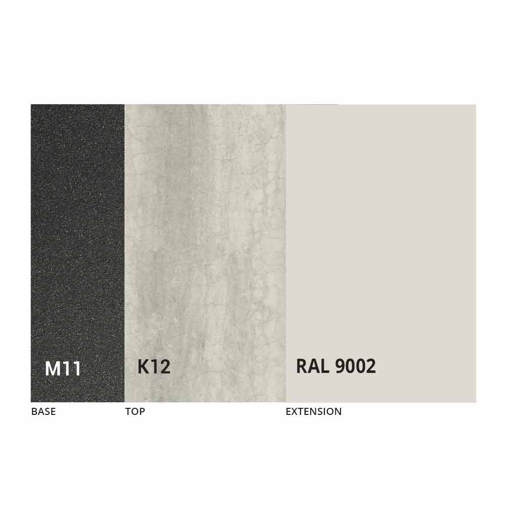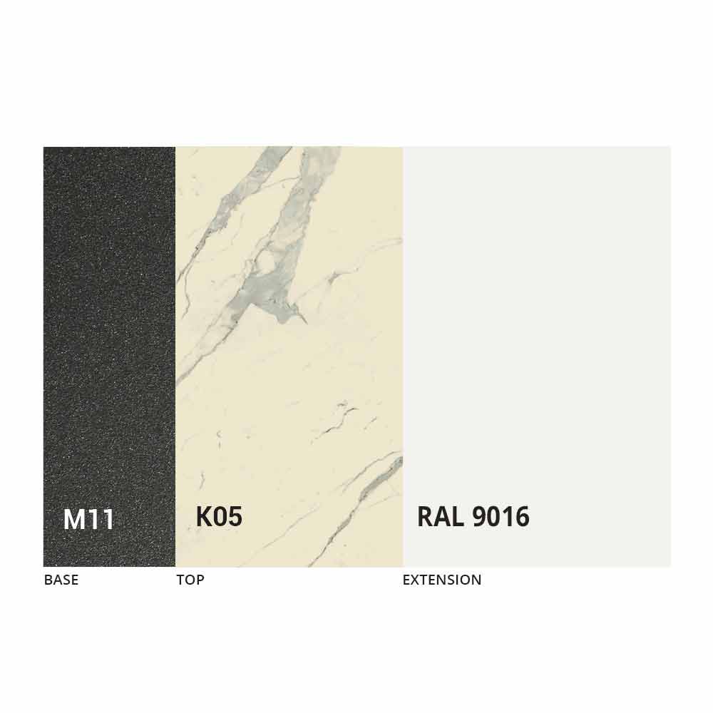 The top and base of the table can be customized with different materials and sample finishes or RAL lacquering. For information, contact us using the appropriate "
