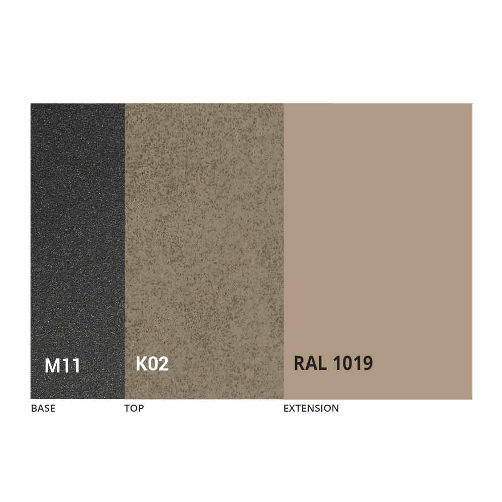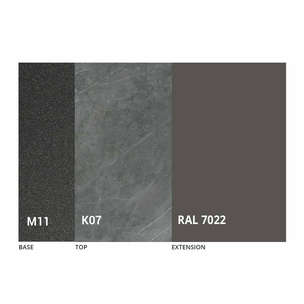 an MDF panel top with laminam ceramic on the surface, available in various finishes, and an embossed graphite painted