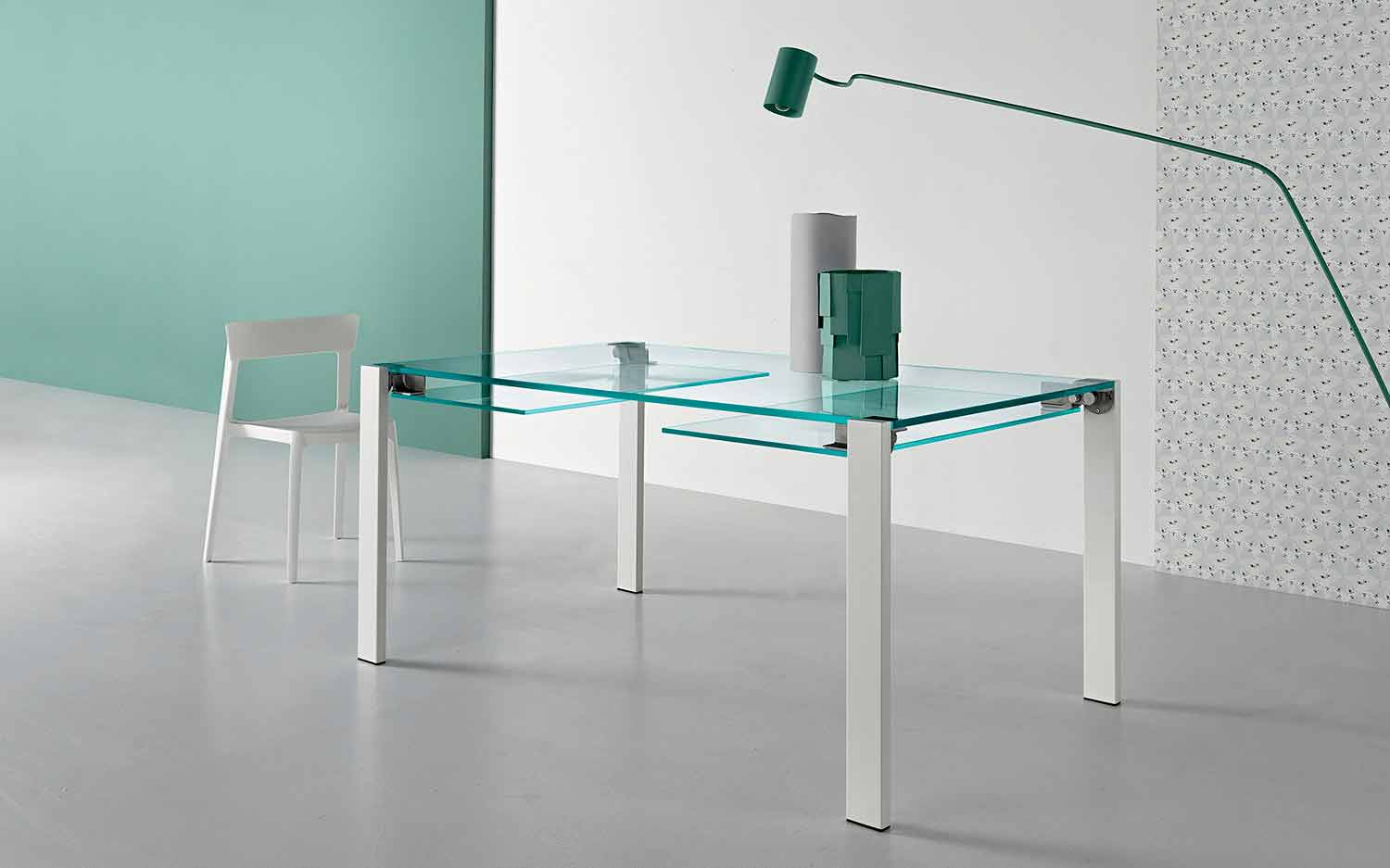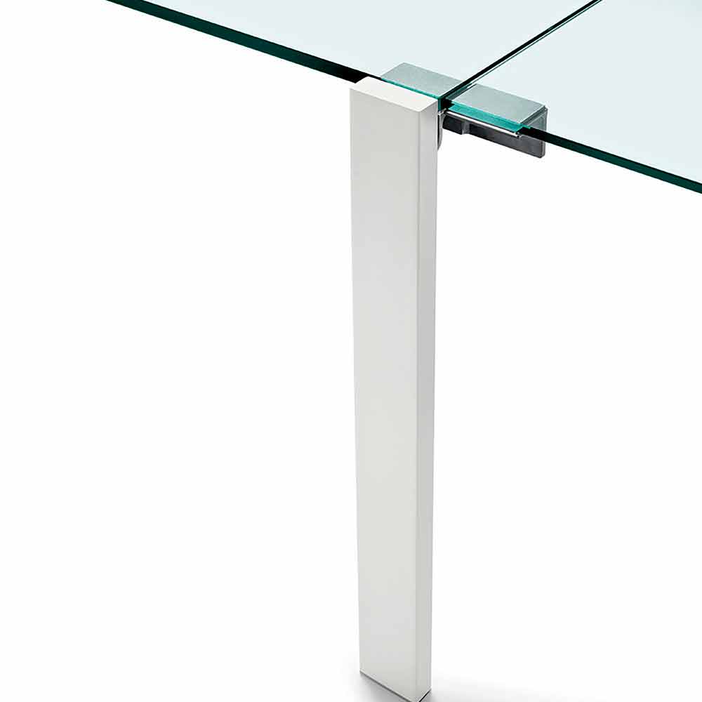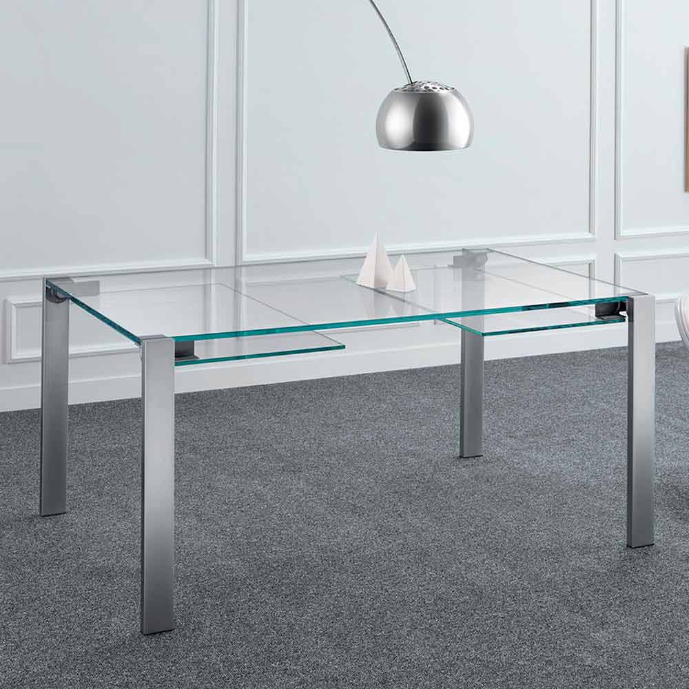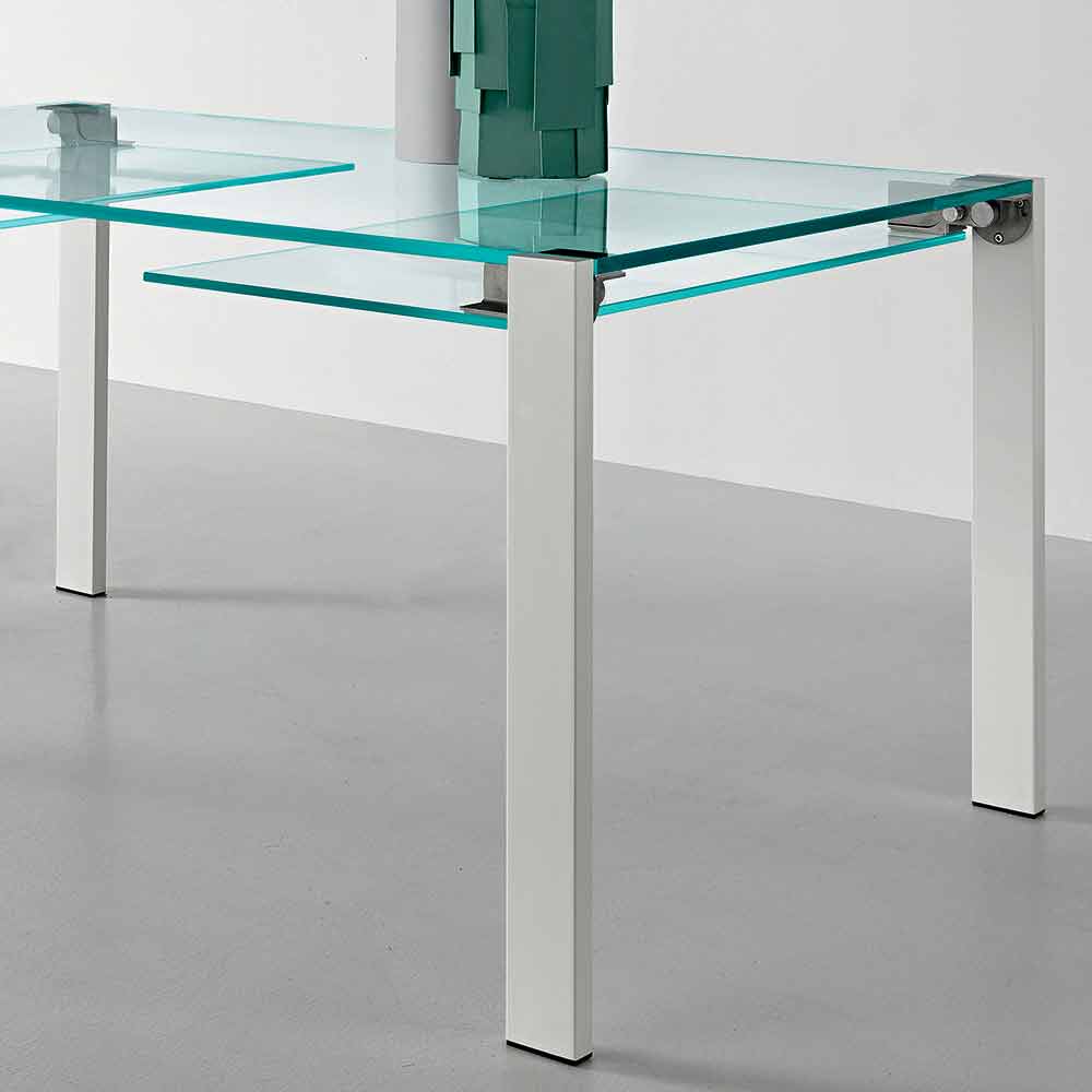 Extra-clear glass table extendable up to 280 cm with chromed or white painted metal base, made in Italy.