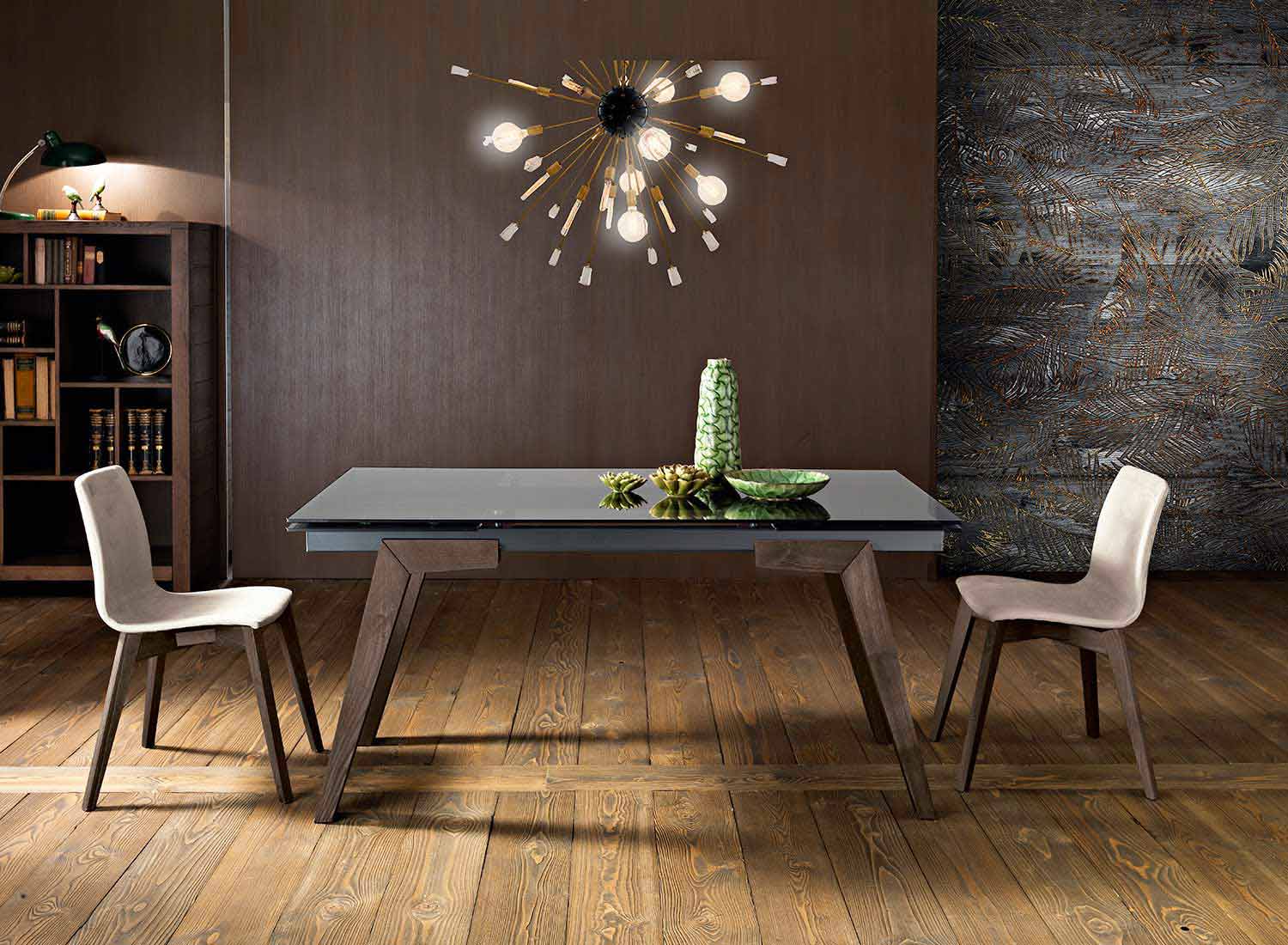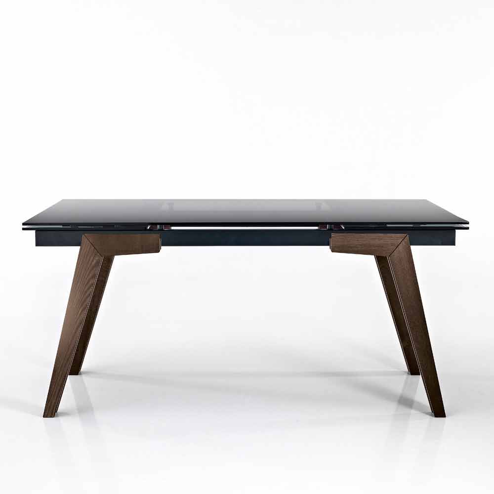 Dimitri is an elegant extendable table made in Italy with a fumè tempered glass surface (thickness 10mm) and oak solid wood legs available in two different finishes: