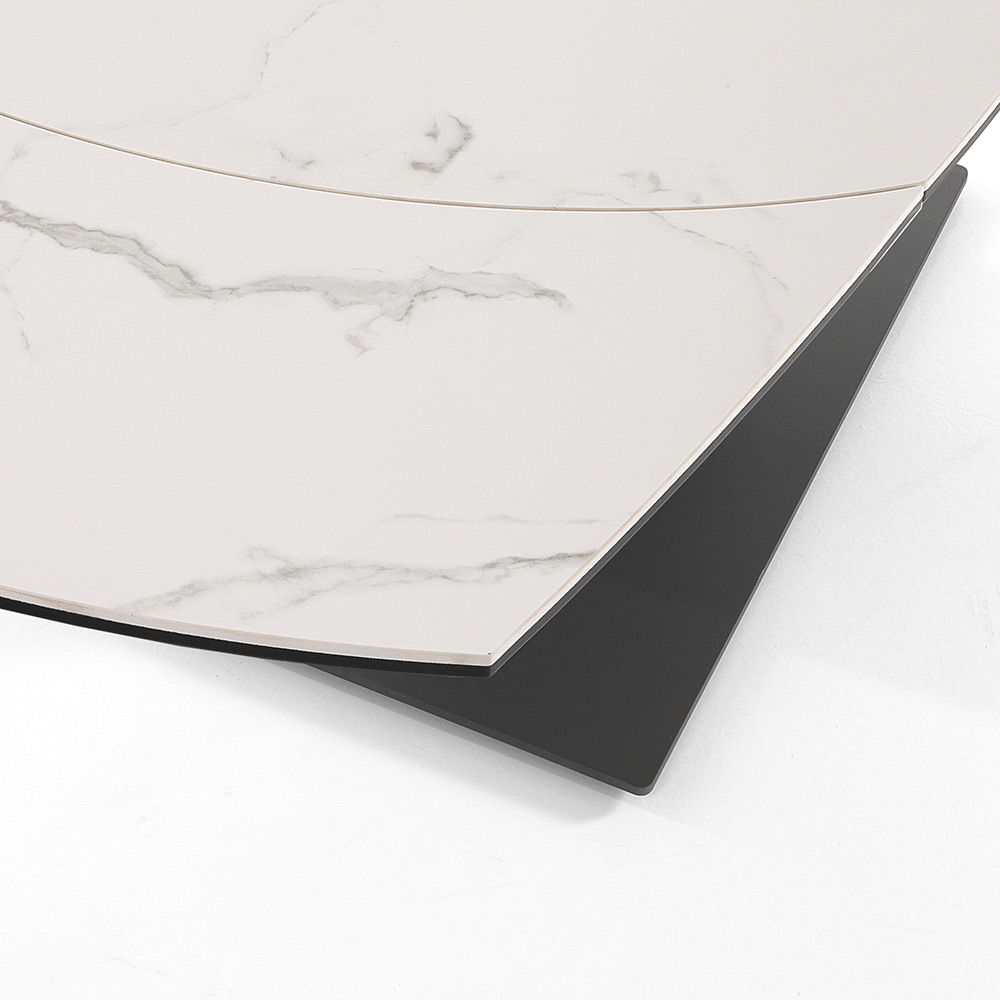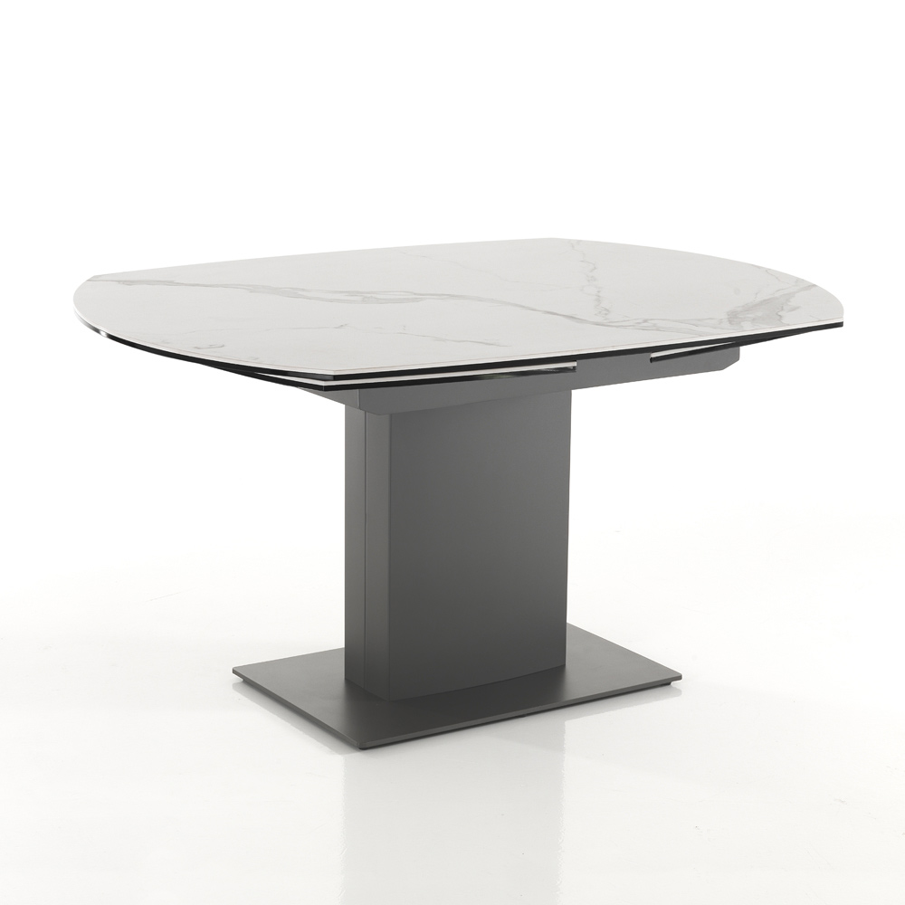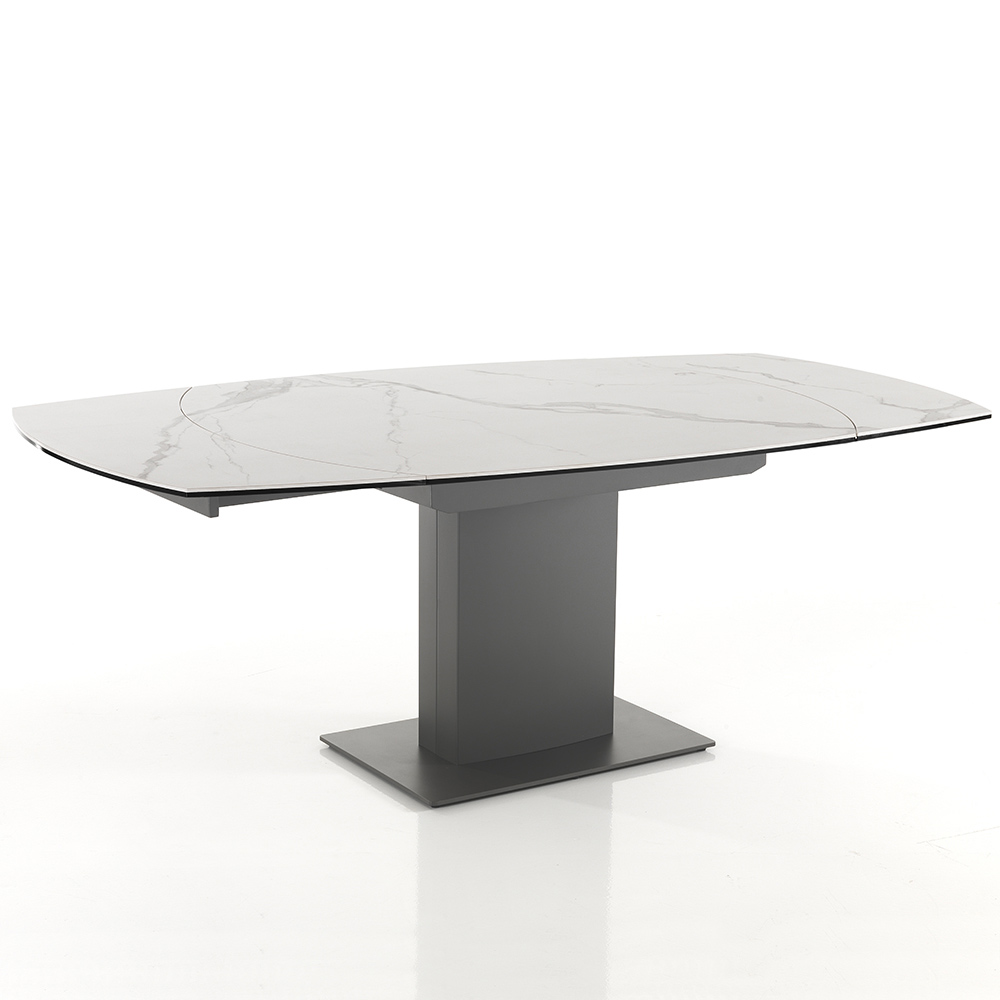 Dining table with extendable top in matt marble effect ceramic.