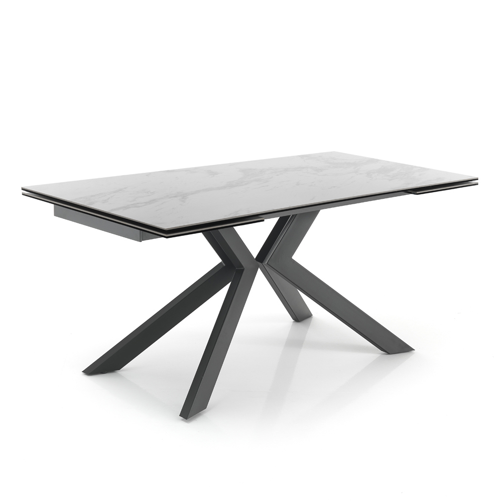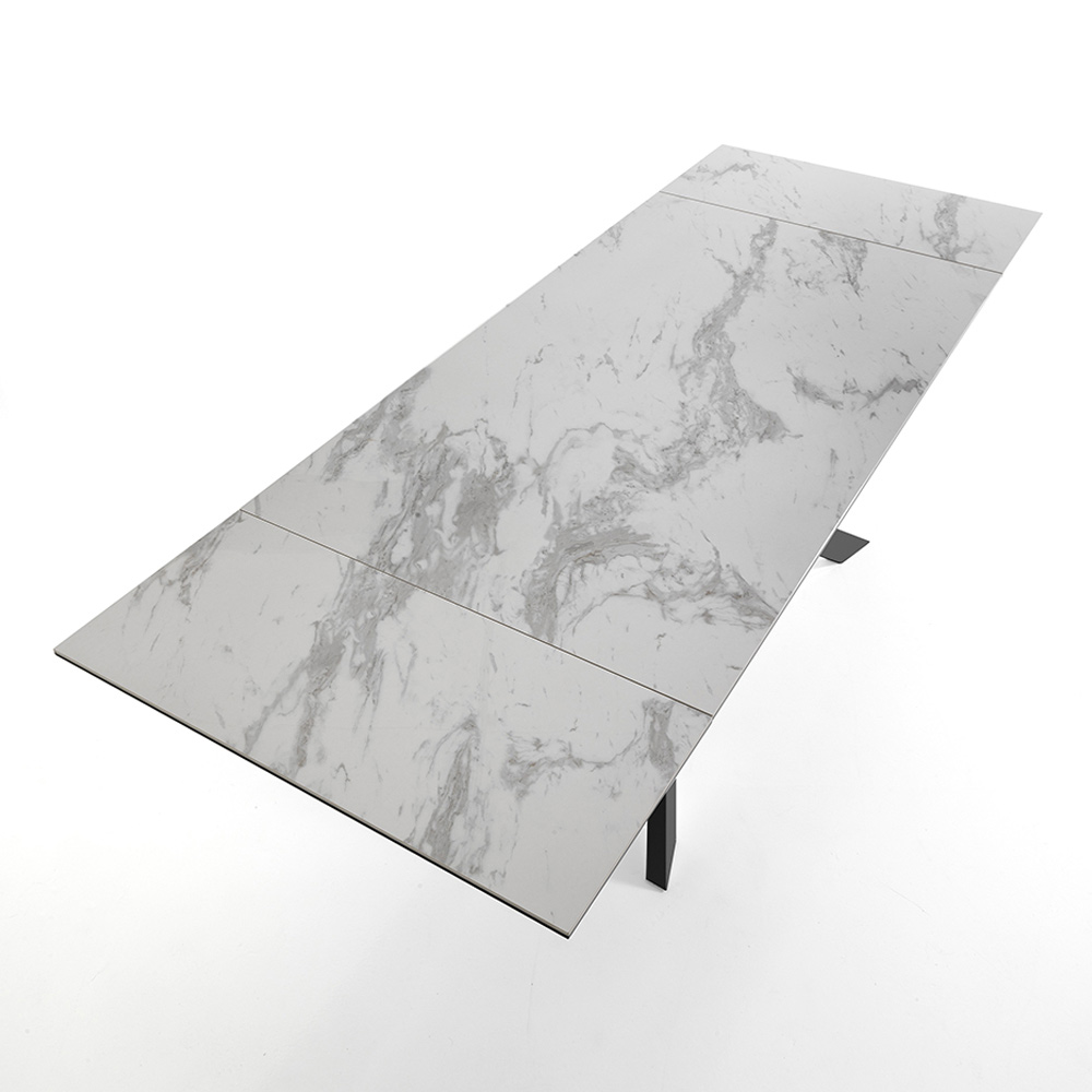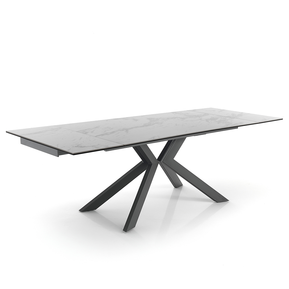 Dining table with base in matt grey painted metal and extendable top up to 240 cm in ceramic with matt white marble finish . 40 cm extensions positioned under the table top. Thanks to the possibility of being extended, it allows you to host a greater number of chinas and relatives to spend pleasant evenings in company.