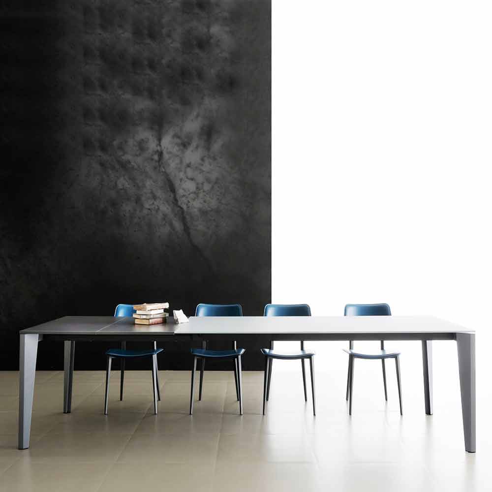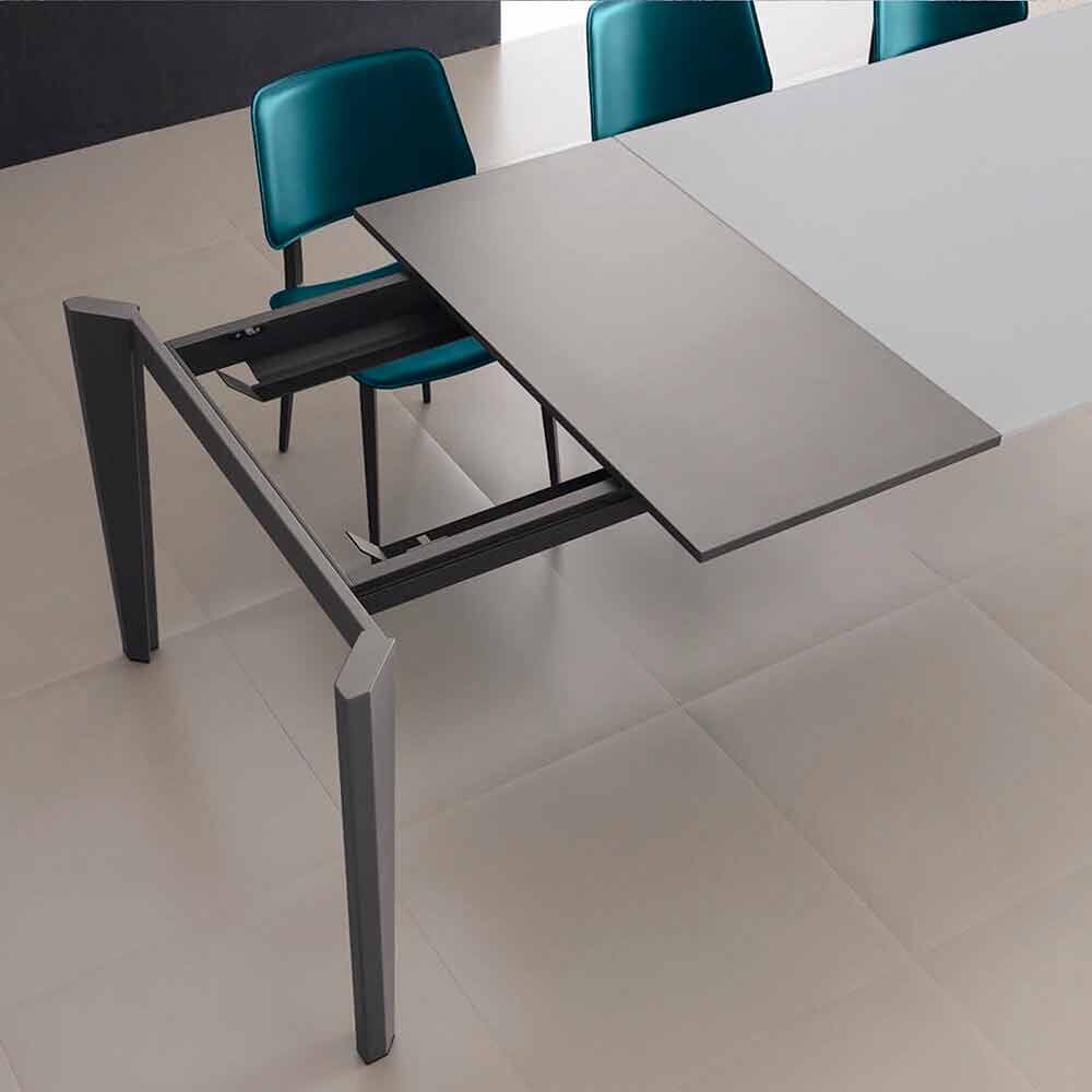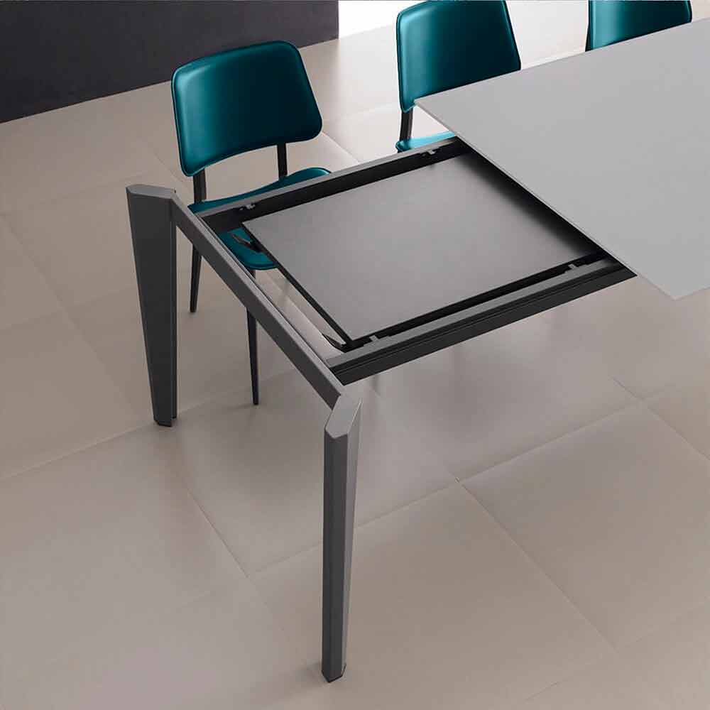 Dining table made in Italy with extendable top in anti-fingerprint satin glass (10mm thick) with powder finish, extension in anthracite melamine and base in anthracite painted metal .