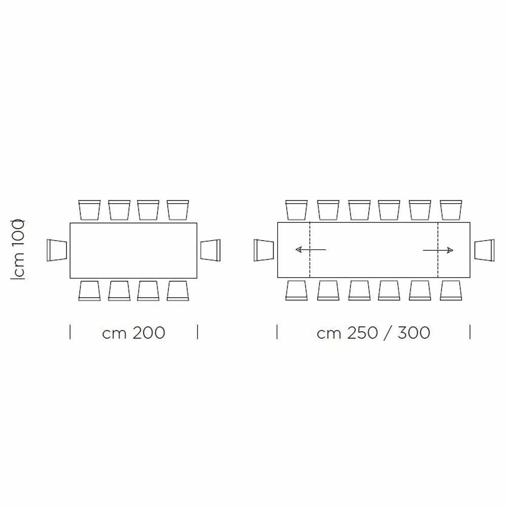 - L 200/300 x D 100 x H 75.3 cm 14 seats (2 extensions of 50 cm).