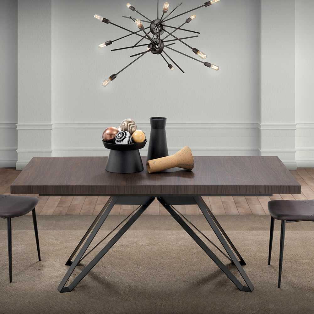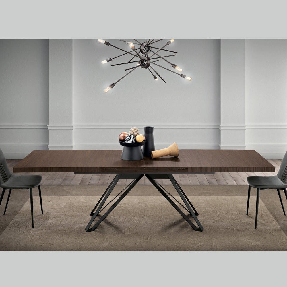 The legs, in black metal in the shape of an inverted A, stand out for their geometric structure and matte finish, an example of how functionality and style can be harmoniously merged. The design allows the table to be easily extended, ensuring it is equally suitable for everyday use as it is for hosting special occasions.
