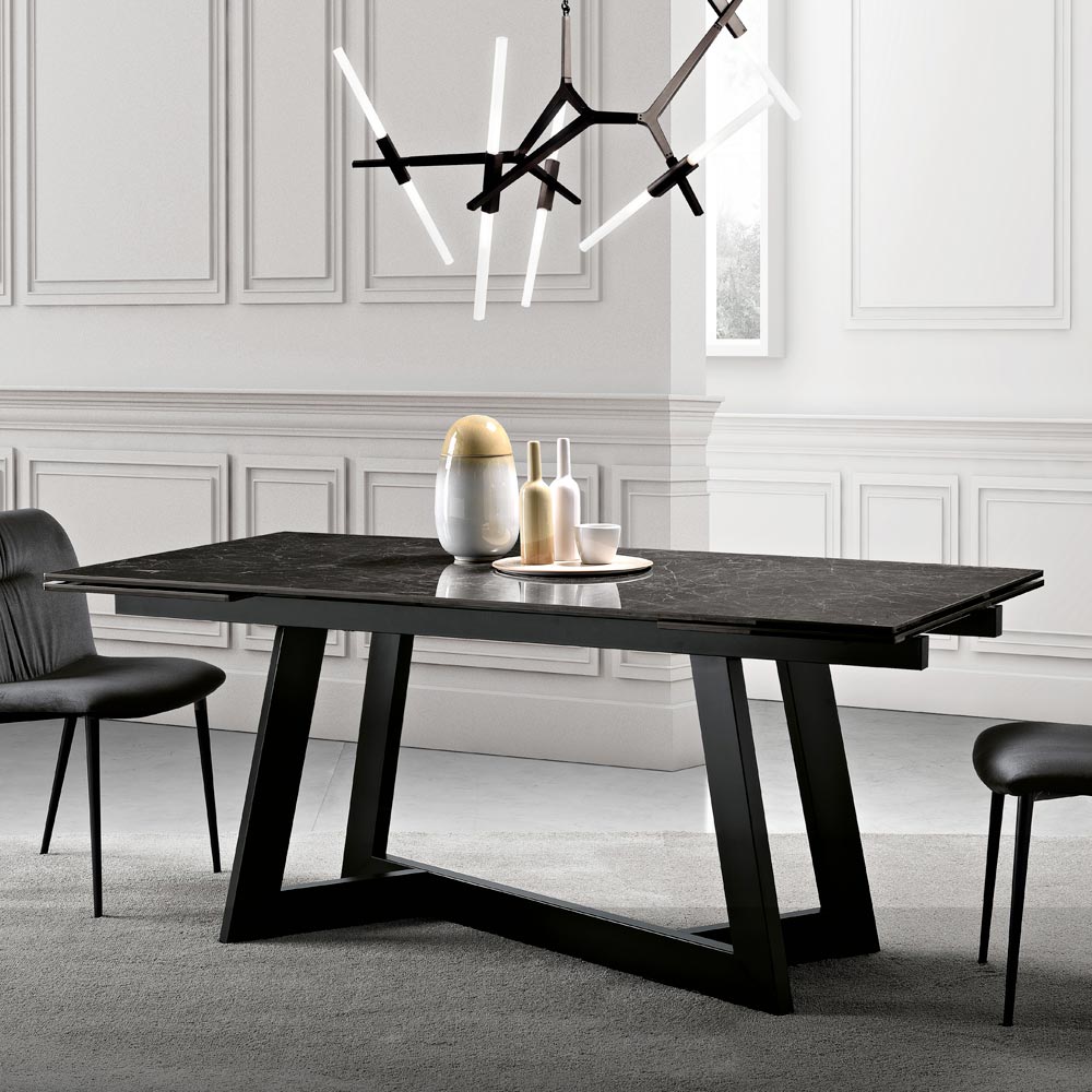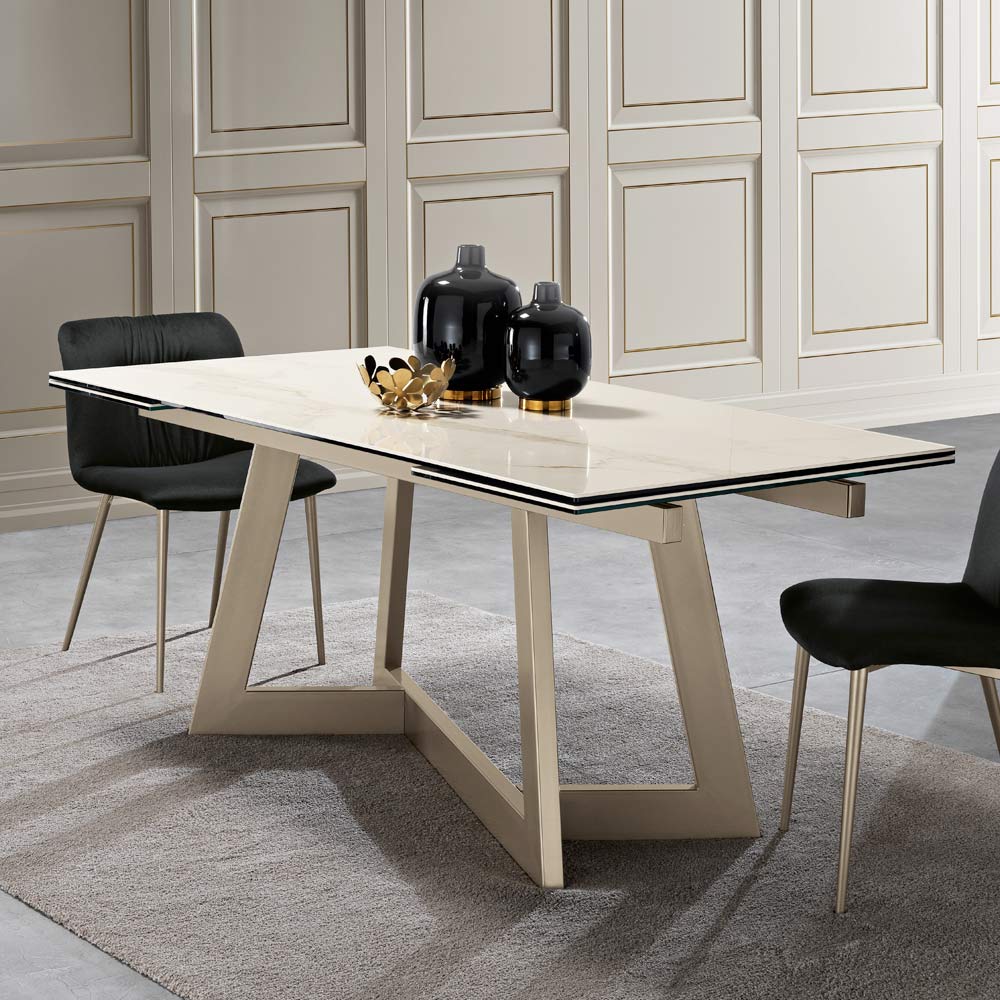 The base is a geometric sculpture that defies gravity: the metal legs, with their zigzagging shapes, are designed not only to offer impeccable support but also to add a distinctive visual signature to the table. This fusion of materials and contemporary design catches the eye and becomes the centerpiece of the dining room.