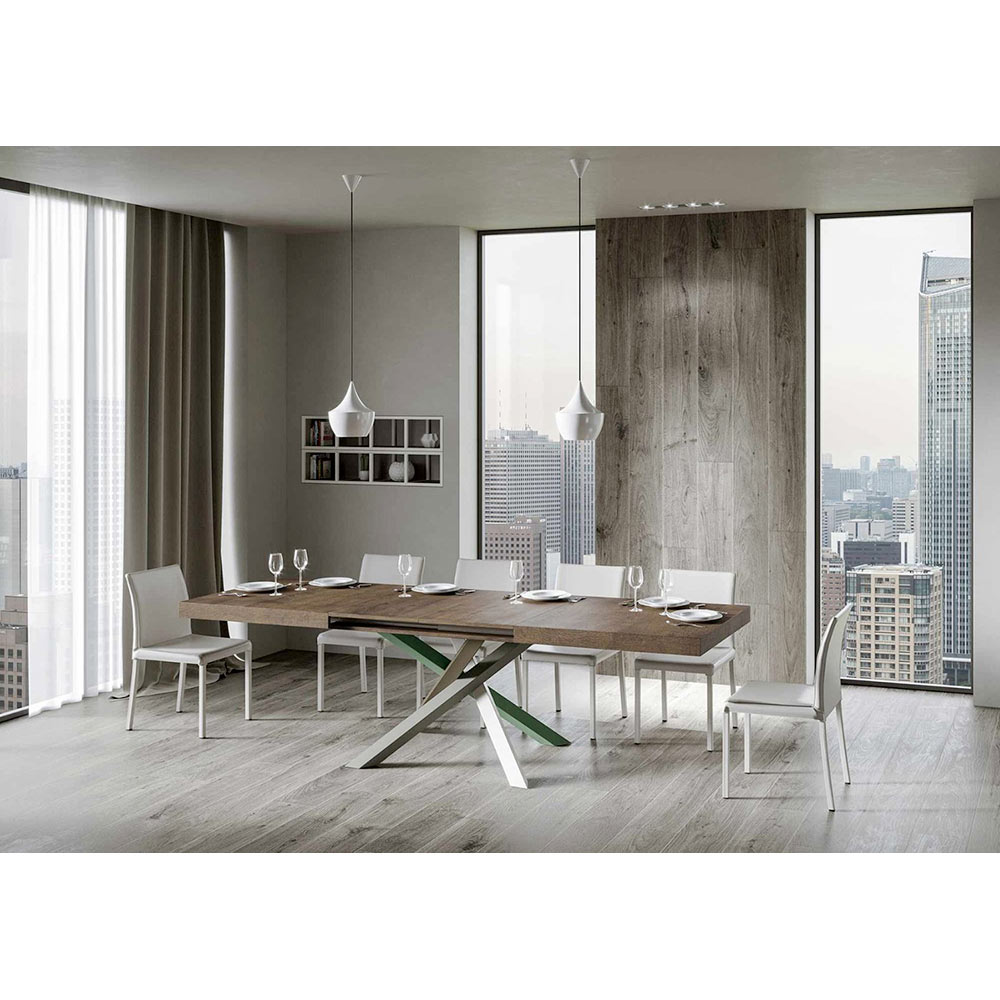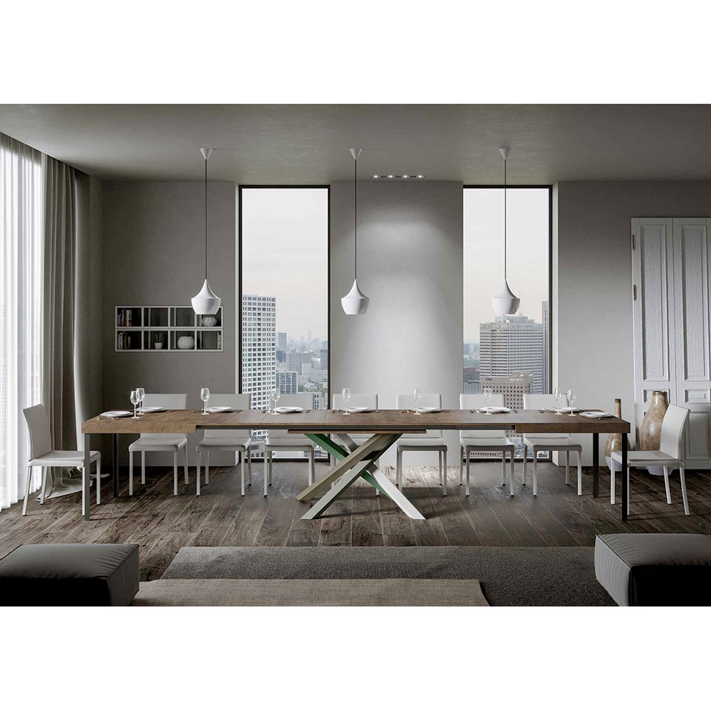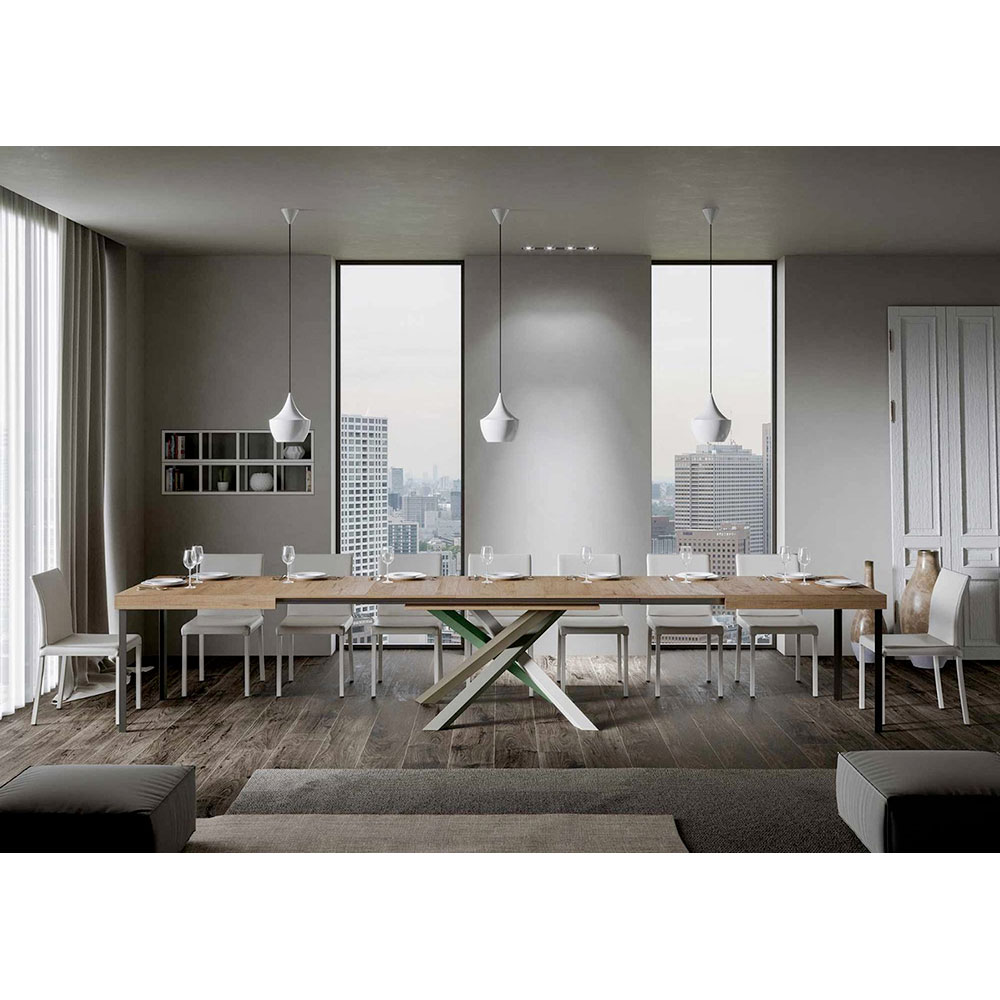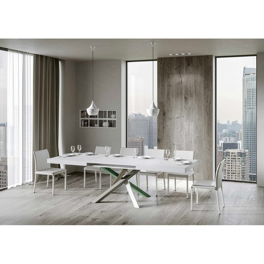 Discover the extendable table, a masterpiece of modern design that stands out for its unique silhouette and versatile functionality. The wood top enhances the brightness of spaces, offering a smooth and sturdy surface that invites daily use.Ā The table base ĆØ a true geometric spectacle, with crossed legs that intertwine in a play of colours.Ā The proposed combination ĆØ : Leg 1: Pure White (RAL 9010). Leg 2: Moss Grey (RAL 7003). Leg 3: Olive Grey (RAL 7002). Leg 4: Reseda Green (RAL 6011).Ā The RAL colours are opaque.Ā This combination not only adds a touch of vitality to the design but also ensures stability and strength. The table extension mechanism ĆØ as simple as it is engineering, allowing this elegant piece of furniture to be transformed from a practical table for four to a cosy area for hosting dinners and larger gatherings.