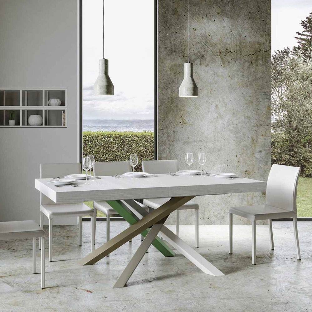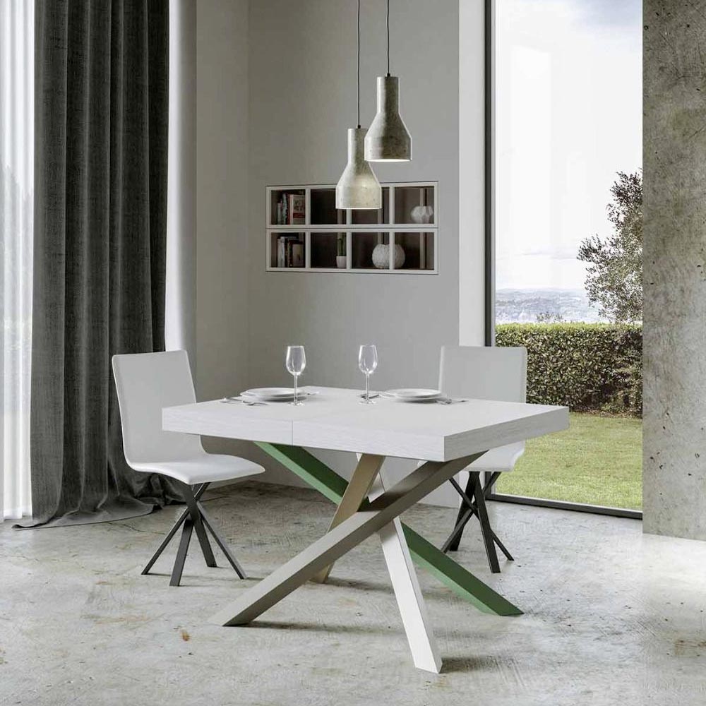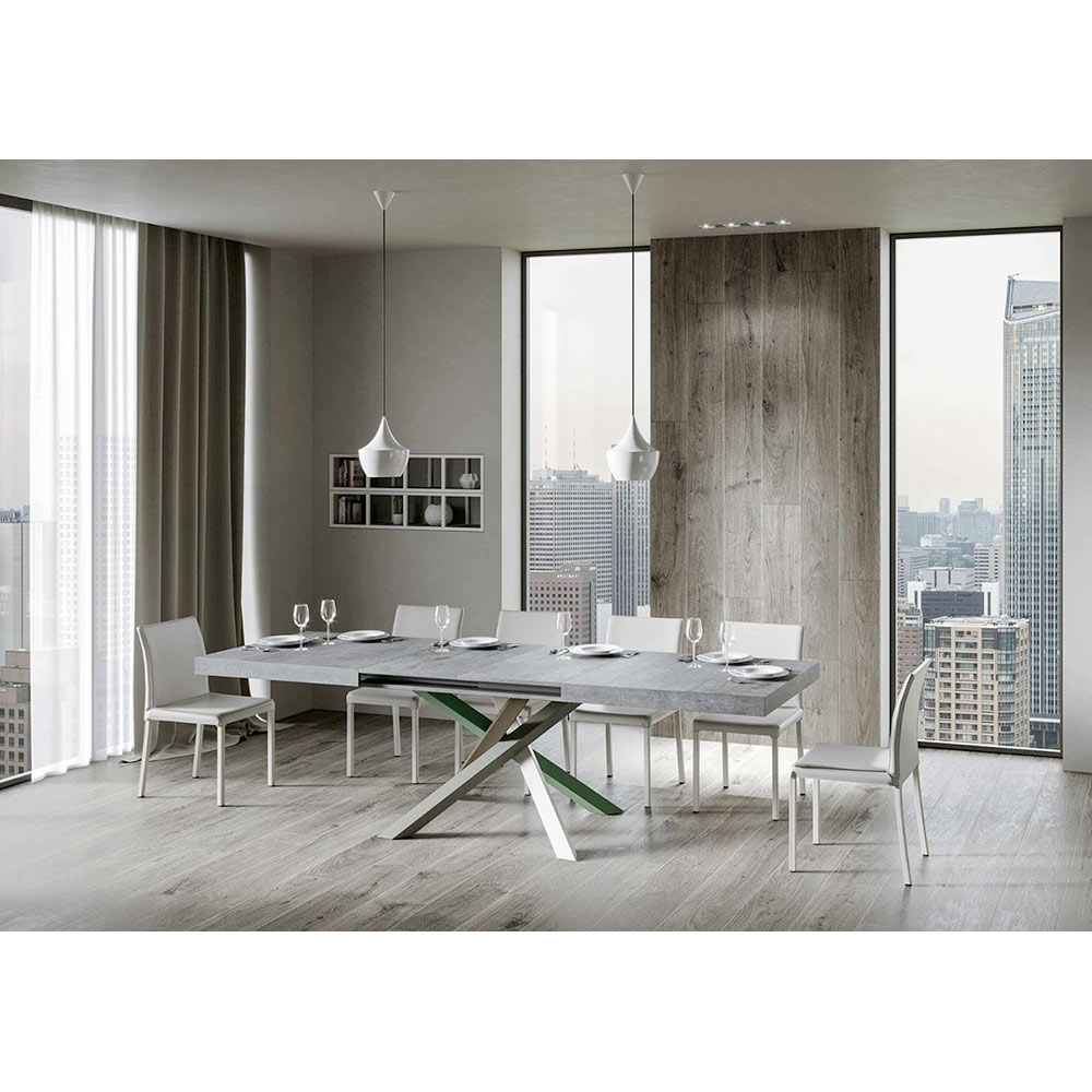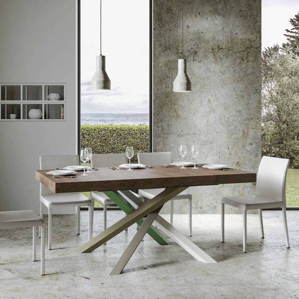Discover the extendable table, a masterpiece of modern design that stands out for its unique silhouette and versatile functionality. The wood top enhances the brightness of spaces, offering a smooth and sturdy surface that invites daily use.Ā The table base ĆØ a true geometric spectacle, with crossed legs that intertwine in a play of colours.Ā The proposed combination ĆØ : Leg 1: Pure White (RAL 9010). Leg 2: Moss Grey (RAL 7003). Leg 3: Olive Grey (RAL 7002). Leg 4: Reseda Green (RAL 6011).Ā The RAL colours are opaque.Ā This combination not only adds a touch of vitality to the design but also ensures stability and strength. The table extension mechanism ĆØ as simple as it is engineering, allowing this elegant piece of furniture to be transformed from a practical table for four to a cosy area for hosting dinners and larger gatherings.